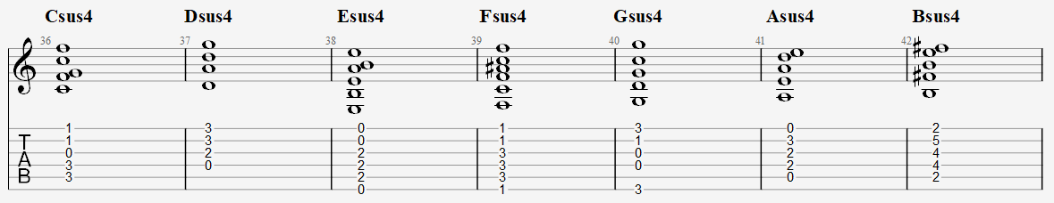 또한 sus4 말고도 sus2가 있는데, sus 뒤에 나오는 숫자가 4라면 1, 4, 5도를 잡고, sus2라면 1, 2, 5도를 잡으면 된다. 코드 이름에 sus가 나오면 일단 3도는 포기한다고 생각하면 좋다. sus 코드는 오직 sus2와 sus4만 있음을 잊지 말자.