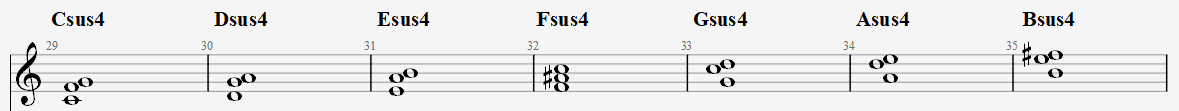 Suspended Chord, 일명 서스는 메이저 코드에서 3도를 4도로 바꿔주면 된다(sus4). 쉽게 말해 코드의 3도 음에 #을 붙이면 된다는 소리. 마이너는 반음 내리고, 서스는 반음 올리면 된다고 외우면 편할 것이다.
