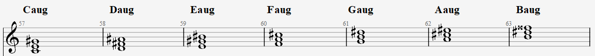 Augmented Chord, 원래는 어그먼티드 코드라고 읽어야 하지만 보통 편의상 어그먼트나 오그먼트 정도로 부르는 이 코드는 메이저 코드에서 5도 음을 반음 올려주면 나오는 코드이다. 불안정한 느낌이 강해서 뒤의 코드에서 편안하게 풀어줘야 한다고 한다(고 하는데 무난한 화성 진행으로 해결하는 것 같다).