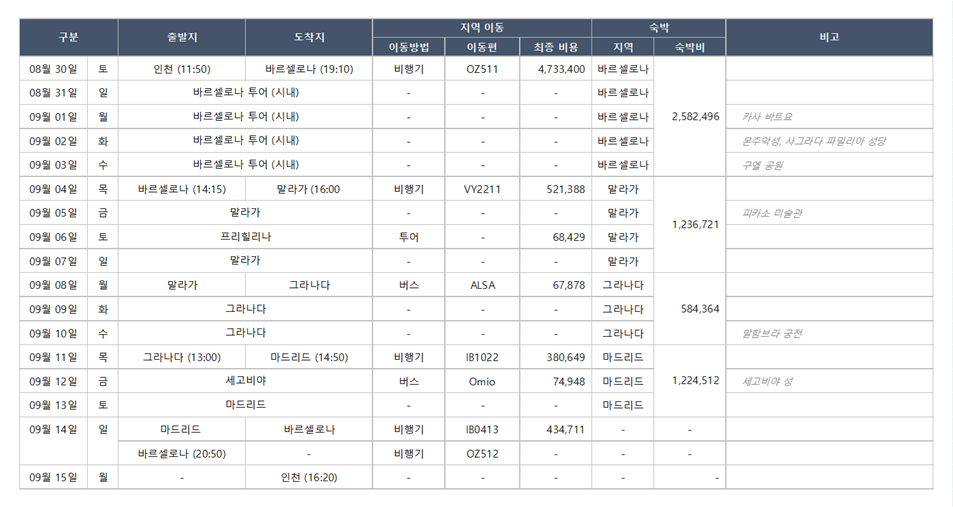 여기서 가장 내 머리를 아프게 만들었던 것은 분명히 아버지도 가보고 싶으신 스페인의 어느 도시가 있으실 건데 분명하게 말씀하지 않으시는 것이었다. 그래서 일단 수많은 블로그와 여행 후기를 참고하여 나름대로 알찬 여행 계획을 수립해서 부모님께 보고(?) 드렸다.