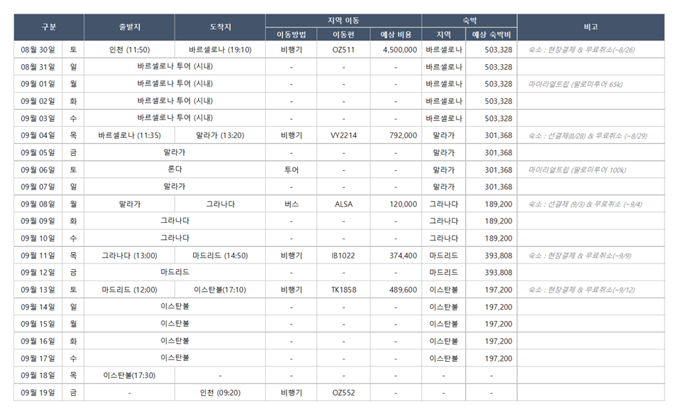 [2] 바르셀로나(5박) → 말라가(4박) → 그라나다(3박) → 마드리드(2박) → 이스탄불(5박)