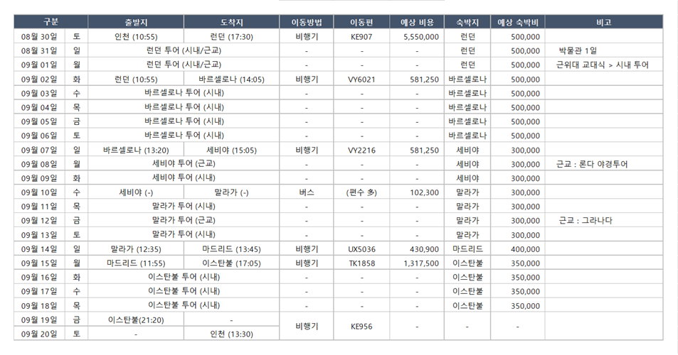 [1] 런던(3박) → 바르셀로나(5박) → 세비야(3박) → 말라가(4박) → 마드리드(1박) → 이스탄불(4박)