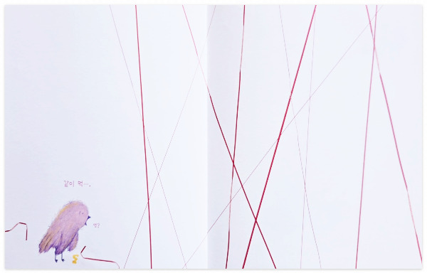 너 앞에서 만나게 되는 빨간 선!! 지렁이를 들고 신이 나서 걸어가던 분홍색 새 앞에 친구인 너는 보이지도 않고 기다란 빨간 선이 놓여있다.