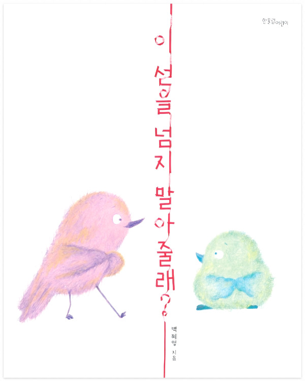 단호한 선을 그은 듯 세로로 내려 쓴 제목이 시선을 사로잡는다. 문제의 세로선을 연결해 제목 글씨를 디자인한 의도도 다분히 느껴졌다. 강렬한 빨간색 선을 사이에 두고 새 두 마리가 서로를 바라보고 있다. 호기심 가득, 애정도 가득한 표정의 분홍색 새와 대조적인 표정의 연두색 새. 연두색 이놈의 표정은 한눈에 봐도 ‘얘가 왜 이러지’였다. 빨간선을 사이에 둔 두 마리의 새. 어른이라면 누구나 한눈에 알아챌 법한 ‘선 넘지 마세요’의 그 선을 찰떡같이 표현한 그림인데, 이 그림의 의미를 아이들도 과연 이해할 수 있을까. 선 너머의 깊고 복잡한 의미를 이해할 수 있을까. 이해했으면 좋겠다는 바람을 품고 새 두 마리의 책을 들고 교실에 들어섰다.