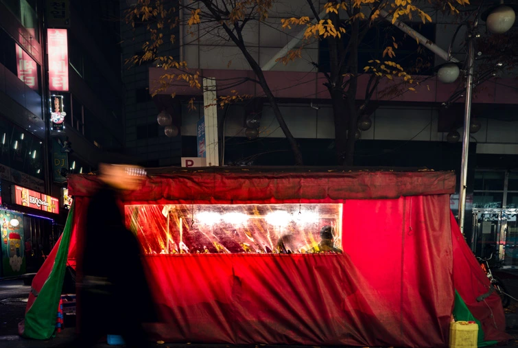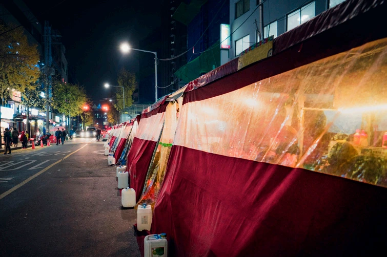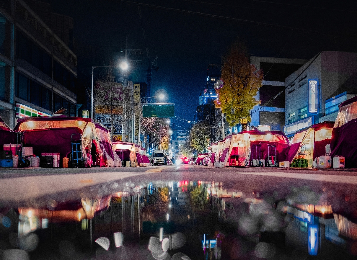 이 포장마차 거리는 해산물이 메인이며 어떤 가게는 수족관까지 구비해 놓았다. 가지각색의 가게들은 저마다의 특색 있는 메뉴를 가지고 손님을 맞을 준비를 한다. 길을 처음 들어서면 생선구이, 튀김, 어묵탕 등 고소한 음식 냄새가 한데 뒤섞여 난다. 마치 이리 오라고 손짓하듯 노랗게 물든 조명과 향긋한 내음들이 우리의 발걸음을 포차 안으로 이끈다. 일상에 지친 무거운 몸을 이끌고 이곳에 온 사람들은 자리에 앉아 서로의 ‘말’이 아닌 ‘귀’를 필요로 하며 넋두리를 늘어 놓는다. 낯설거나 특별한 음식은 아니지만 누구와 어디서 먹는지에 따라 그 의미는 남달라진다. 천막이 드리워진 작은 공간 속에서 세상살이에 바쁜 사람들이 친구나 가족과 이야기를 나누며 위로를 받고 추억과 그리움을 다룬다.