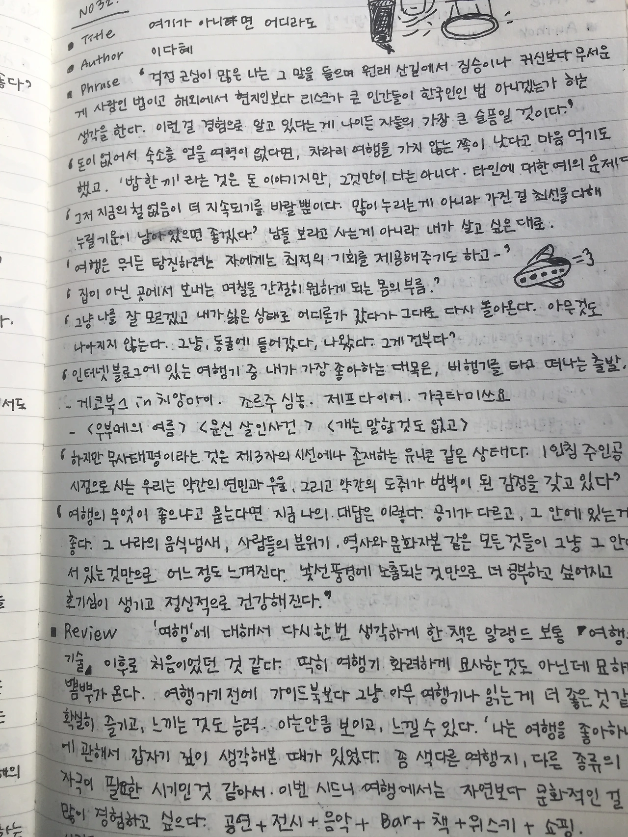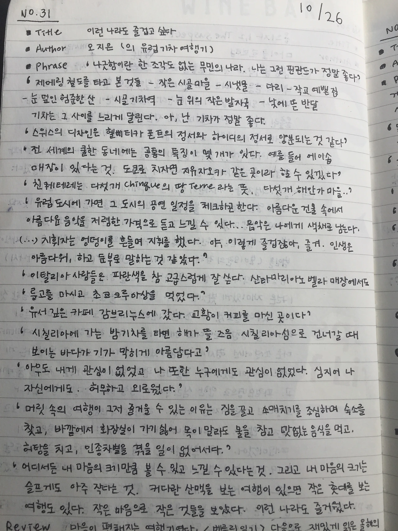 아마, 필사가 가장 쉽게 시도해볼 수 있는 독서노트법이 아닐까 합니다. 10월 말, 여행이 너무 가고 싶었던 나머지 여행 에세이를 연달아 두 권 읽었네요. 오지은 싱어송 라이터의 <이런 나라도 즐겁고 싶다> 이다혜 작가의 <여기가 아니면 어디라도> 두 에세이 모두 추천드립니다. 요즘처럼 해외여행 가기 힘든 때에 여행 에세이를 읽으며 마음을 달래보는 것도 좋겠네요:)