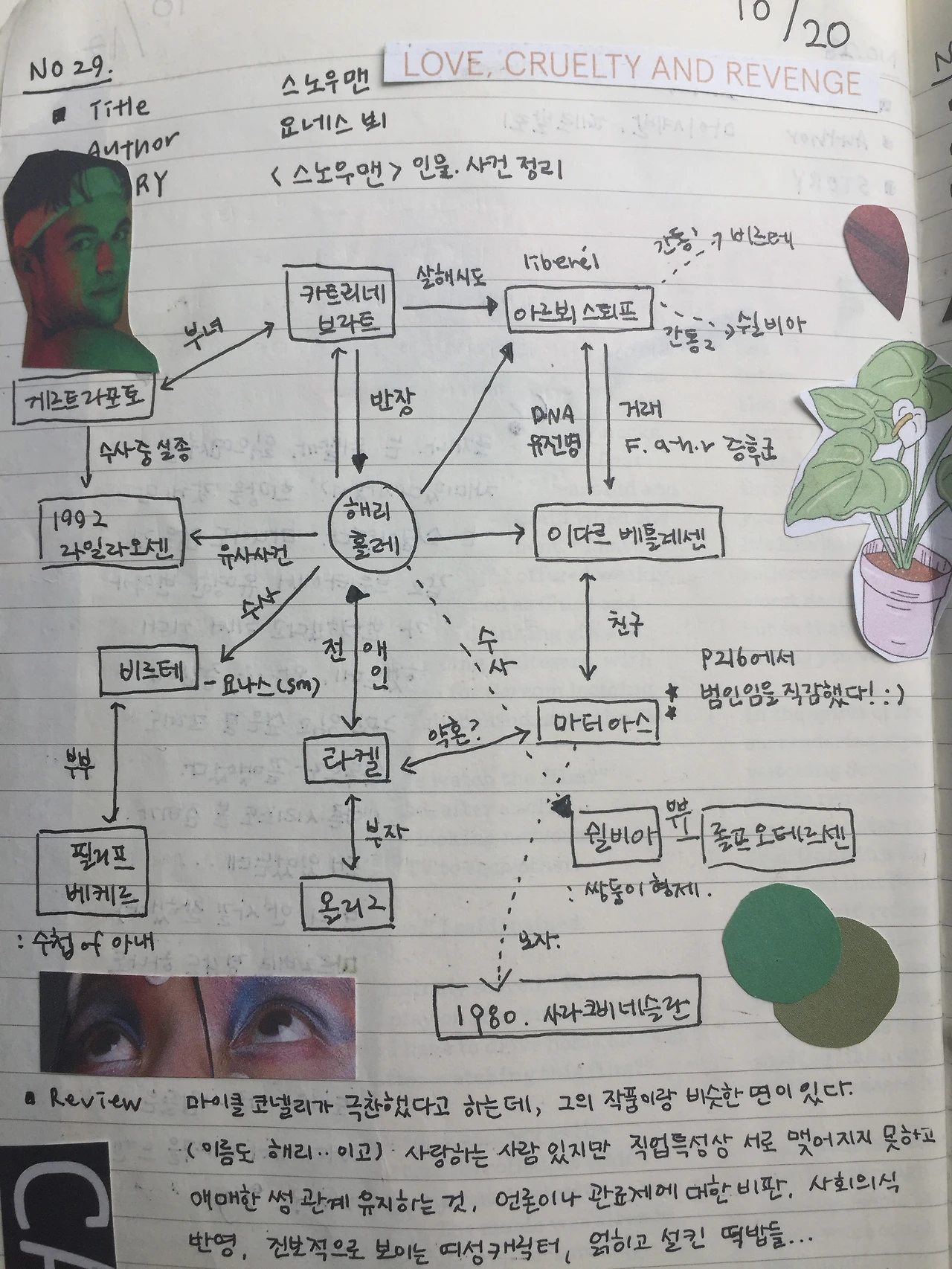 소설책 한 권을 읽고나면, 누가 누구였는지 무슨 내용이었는지, 결말은 어떻게 끝났는지 금방 잊어버리기 쉽습니다. 인물관계도를 그리면, 조금 더 오래 기억할 수 있습니다. 2018년에 읽은 책이라 내용이 가물가물하지만, 이 기록을 보니 어렴풋이 내용이 떠오르네요. 마이클 코넬리의 작품을 보면서 범죄 소설에 빠지게 되어 요 네스뵈의 <스노우맨>을 읽었습니다.