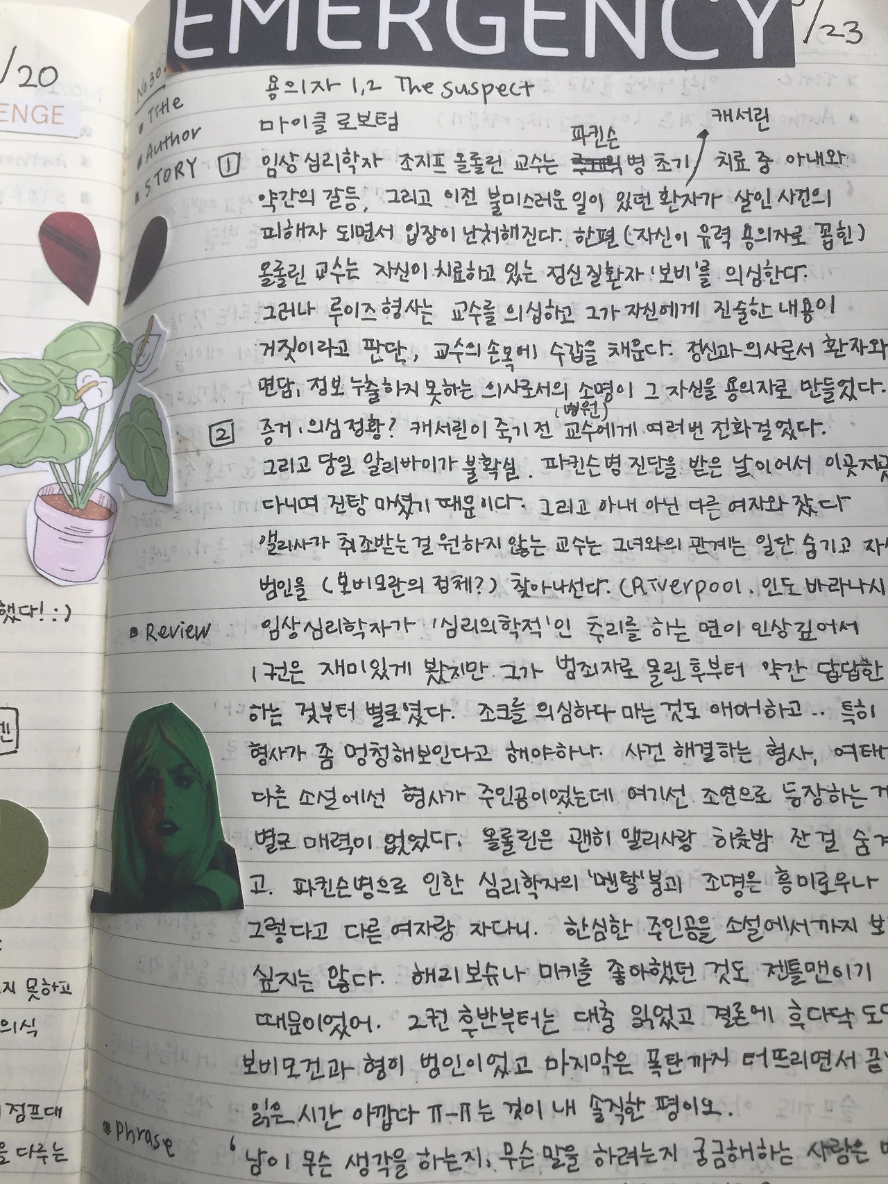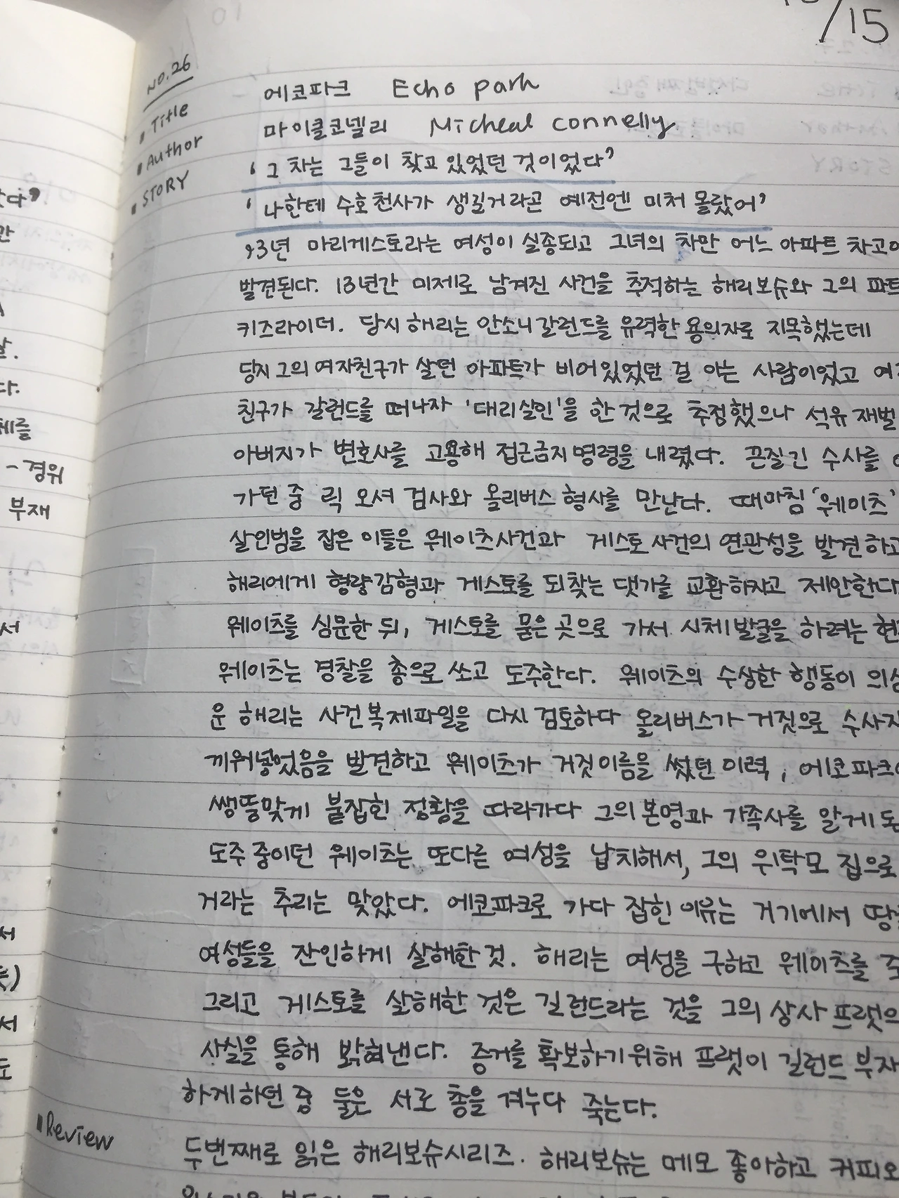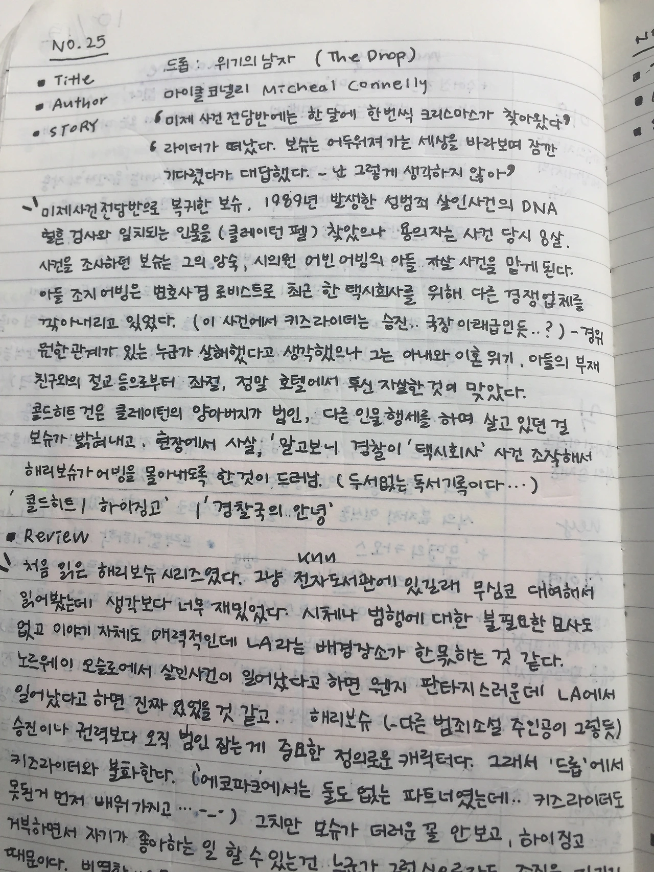 줄거리를 요약하는 가장 효과적인 방법은 책을 읽으면서 미리 굵직한 사건과 캐릭터 이름을 써 두는 것입니다. 그러면 독서노트를 쓸 때 일일이 이름이나 지명, 사건의 정황을 찾지 않아도 되어 시간을 절약할 수 있습니다. 10월에 저는 범죄소설 작가 마이클 코넬리의 작품에 푹 빠져있었습니다. 마이클 코넬리의 모든 작품을 있겠노라 다짐했는데 워낙 다작하신 분이라.. 아직 반도 못 읽었네요 ^^;