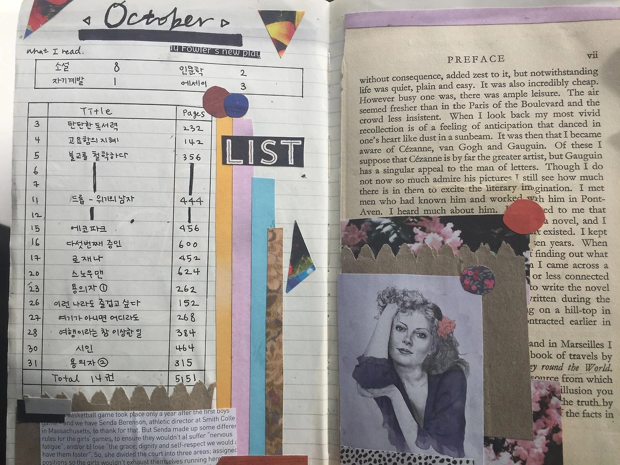 매월 말에는 이렇게 어떤 책을 읽었는지 1~2페이지에 정리합니다. 잡지는 'Frankie'라는 호주 인디 매거진을 활용했고요. 집에 안 읽는 헌 영문서적이 있어서 서문의 한페이지를 쭉 오려 붙였습니다. 문구류가 흔치 않은 나라에 살고 있다보니, 스티커나 마스킹테이프 같은 다꾸 재료를 사기가 힘들어서, 부족한대로 꾸며보았습니다. 그러고보니 올해 독서노트에는 다꾸를 거의 하지 않았네요.