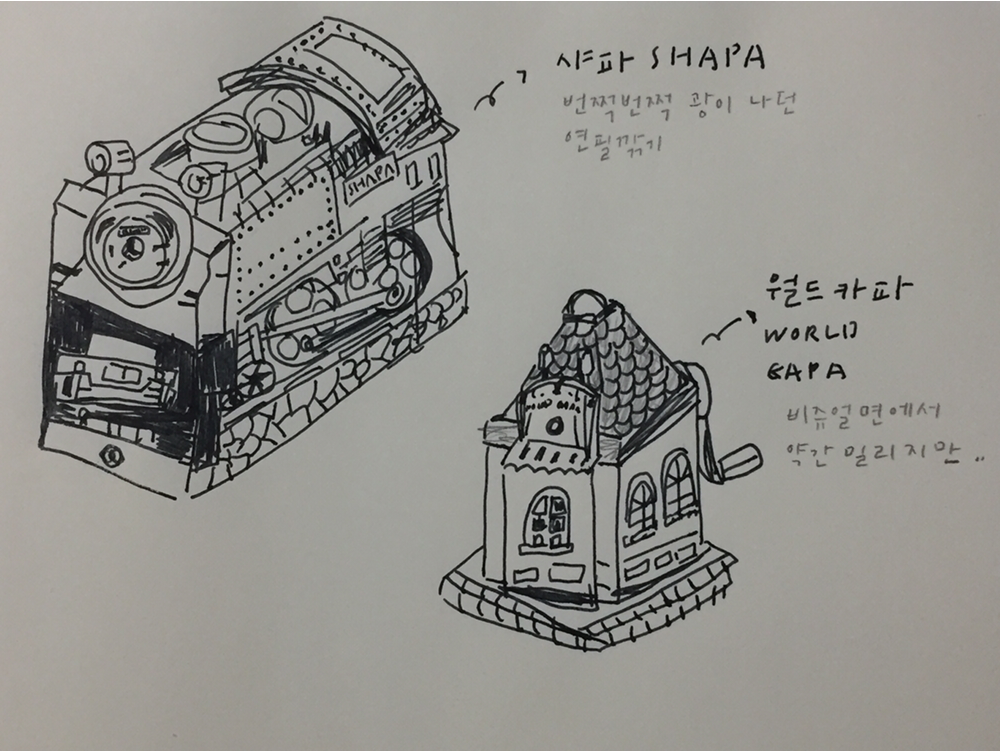 지금도 그런진 모르겠지만 이제 막 초등학교에 입학한 아이들은 아직 글씨 쓰는 게 서툴다는 이유로 암암리에 샤프를 쓰는 게 금지되어 있었다. 쪼끄만 어린애들은 샤프는 언니, 오빠들이 쓰는 거구나, 쉽게 수긍했다. 나는 샤프가 너무너무 쓰고 싶었지만 연필 깎는 일을 좋아해서 참을 수 있었다. 연필 깎기의 손잡이를 돌릴 때 연필이 깎여나가는 소리가 꼭 기차가 달리는 소리 같았다. (그래서 은색 샤파 연필 깎기가 기차 모양이었구나)
