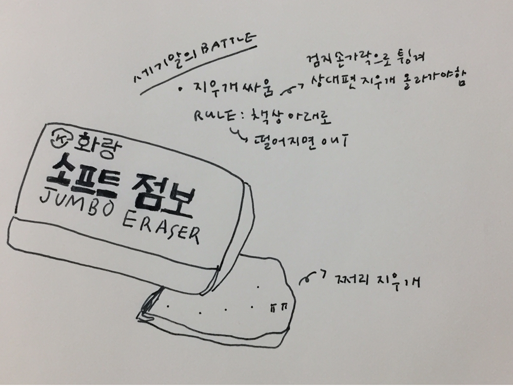 당시 초등학생들 사이에서는 손가락으로 지우개를 튕겨서 상대방 지우개 위에 올리면 이기는 게임이 유행이었다. '화랑'이라는 회사에서 만든 커다란 소프트 점보 지우개만 있으면 웬만한 게임에서는 이길 수 있었다. 탄력이 좋아 잘 튕겨져 나가고 각이 져 있어 잘 굴러가지 않기 때문이었다. (책상 아래로 굴러 떨어지면 실점하게 된다.)