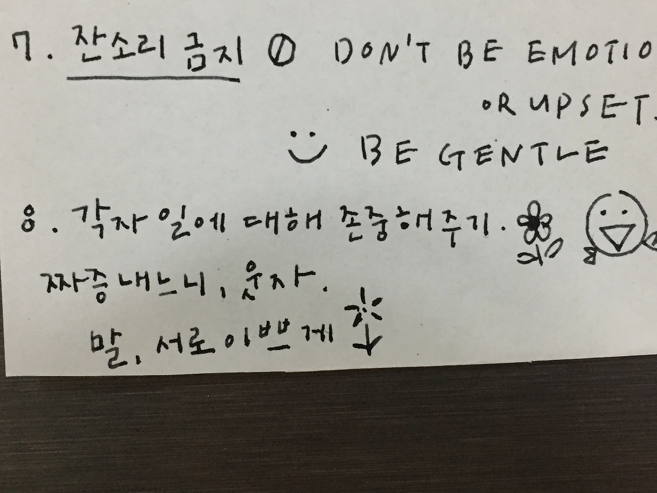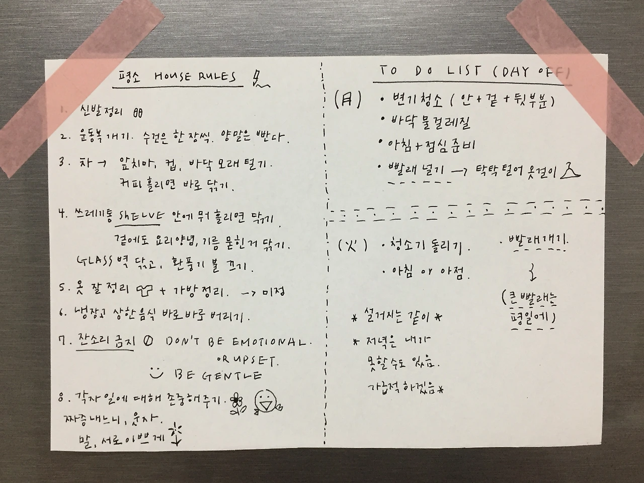 그래서 에이포 용지를 펼쳐서 하우스 룰을 하나하나 적기 시작했다. 반으로 접어 왼쪽에는 각자가 지켜야 할 기본 룰을 적었다. 내가 지켜야 할 항목은 '잔소리 금지' 였다. 감정적이거나 짜증 섞인 말을 뱉기보다 차라리 패널티를 부과하면 좋겠다고 덧붙였다. (패널티는 아직 정하지 못했다) 그리고 오른쪽에는 남편이 쉬는 날 해야 할 집안일의 목록을 적었다. 남편은 매우 기뻐했다. 이제 쉬는 날 눈 떠서 뭘 해야 하는지 내 눈치 보지 않고, 써 있는 것만 얼른 하고 편하게 쉴 수 있으니 좋다면서..... 아무튼 이렇게 기본적인 걸 굳이 써야 하나 싶었지만 효과는 놀라웠다.