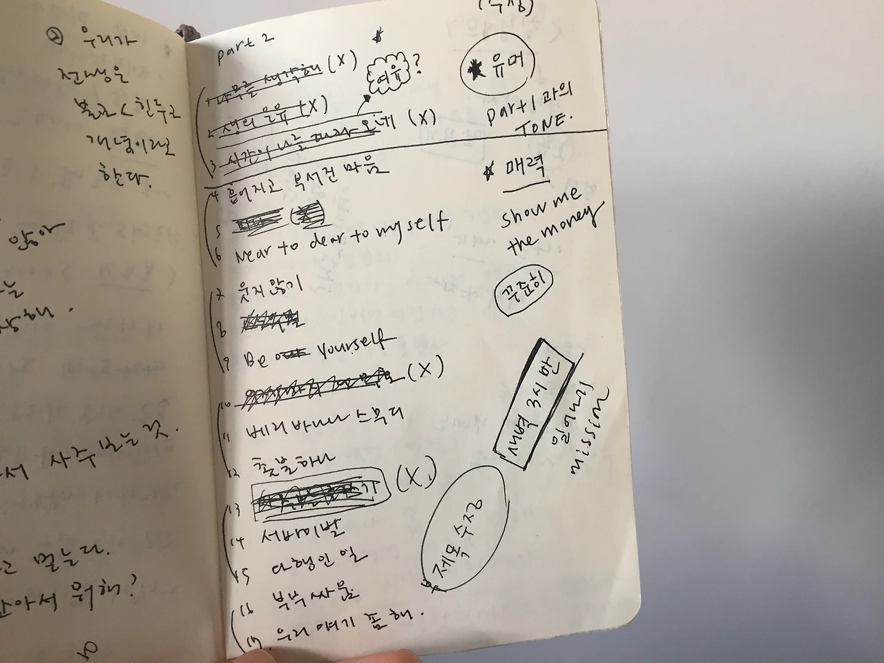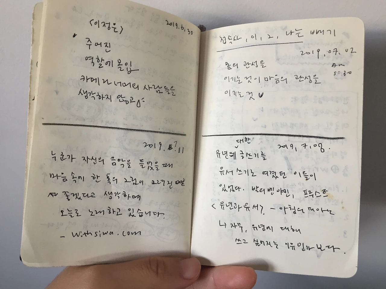 노래 가사를 적기도 해요. 오른쪽에 적은 가사는 선우정아의 '쌤쌤'이라는 곡입니다. 너무 좋아하는 곡이에요 ㅠ