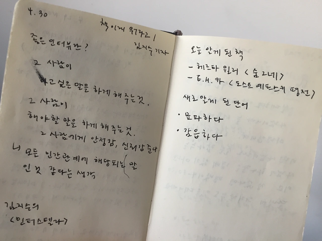 저에게 메모는, 뇌 새김.. 마음 새김. 쓰고 나서 잊어버려도, 메모한 내용은 저도 모르는 사이 내면 어딘가에 저장되어 있다는 생각을 해요. 저는 혼자 일을 하기 때문에 주변에 저를 가르쳐 줄 스승이나 선배가 없어서, 책과 인터뷰 기사를 보고 배워요. 커리어 면에서 좋은 스승을 만나고 싶다, 염원하면서 문득 주위를 둘러보면, 다양한 방법으로 저를 가르치는 매개들이 있더라고요!