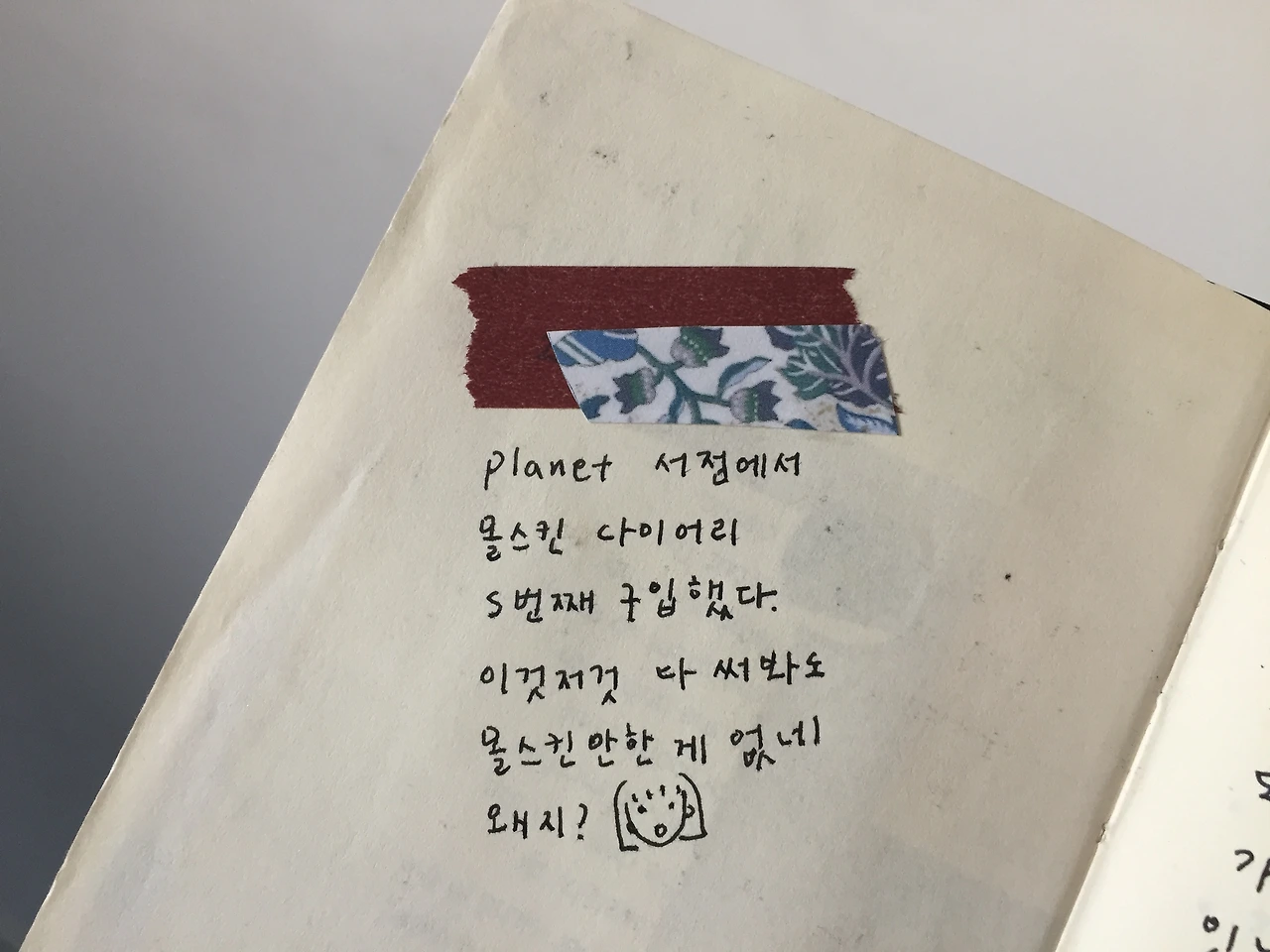 그냥 머릿속에 생각나는 대로 아무 말 적습니다. '아무 말'이 나중에 봤을 때 훨씬 재밌더라고요. 참고로 자주색은 마스킹 테이프이지만 앞쪽 꽃무늬는 마스킹 테이프가 아닙니다. 종이 잘라서 붙여보았어요. 감쪽... 같죠? 일상생활에서 저는 미니멀리즘을 추구하려고 합니다. 마스킹 테이프도 하나를 사면 다 쓰기까지 너무 오래 걸리더라고요. 서랍 속에 안 쓰는 물건이 쌓여가는 걸 자제하려고 해요.