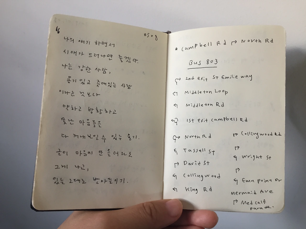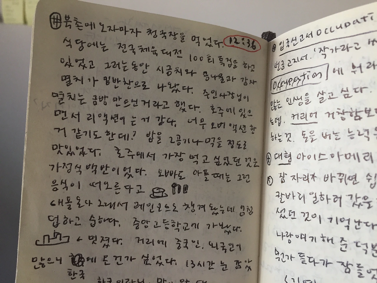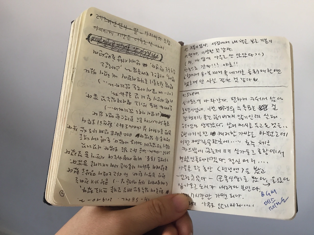 훌쩍 건너뛰어, 작년 10월 한국 여행기를 썼네요. 읽고 있으니, 또 가고 싶은 한국. 싱가포르 공항에서 '데스페라도'가 흘러나왔나 봐요. 파란 글씨로 적어놓았네요. 기내에서 너무 심심해 진짜 오랜만에 런닝맨을 봤는데, 혼자 눈물 흘리면서 웃었더랬어요. 인천 공항에 점점 가까워질 때의 그 설렘, 조만간 한국 갑니다!!ㅎㅎ