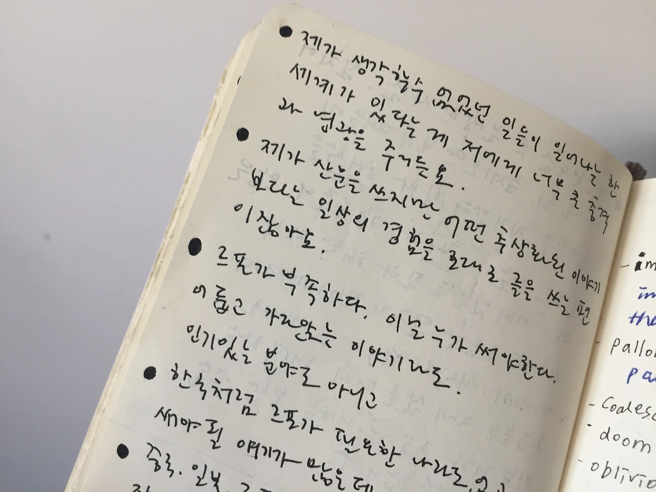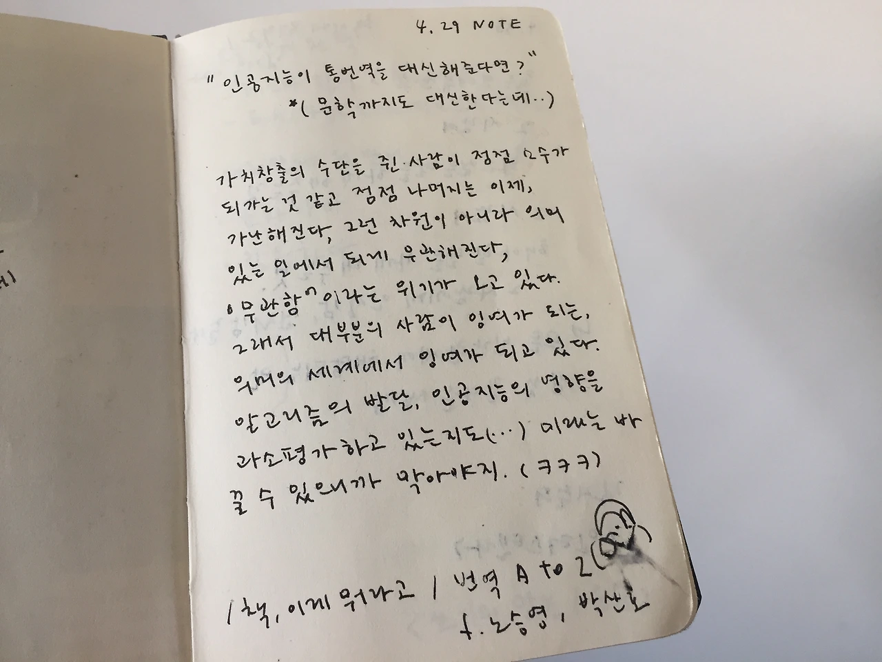 책을 쓰고 있던 때였네요. 글 쓰는 게 너무 즐거웠던 순간을 기록으로 남겨두고 싶었어요. 기록을 할 때는 종종 어디서 기록했는지 장소를 적기도 해요. Vincent library에서 적었네요...ㅎ