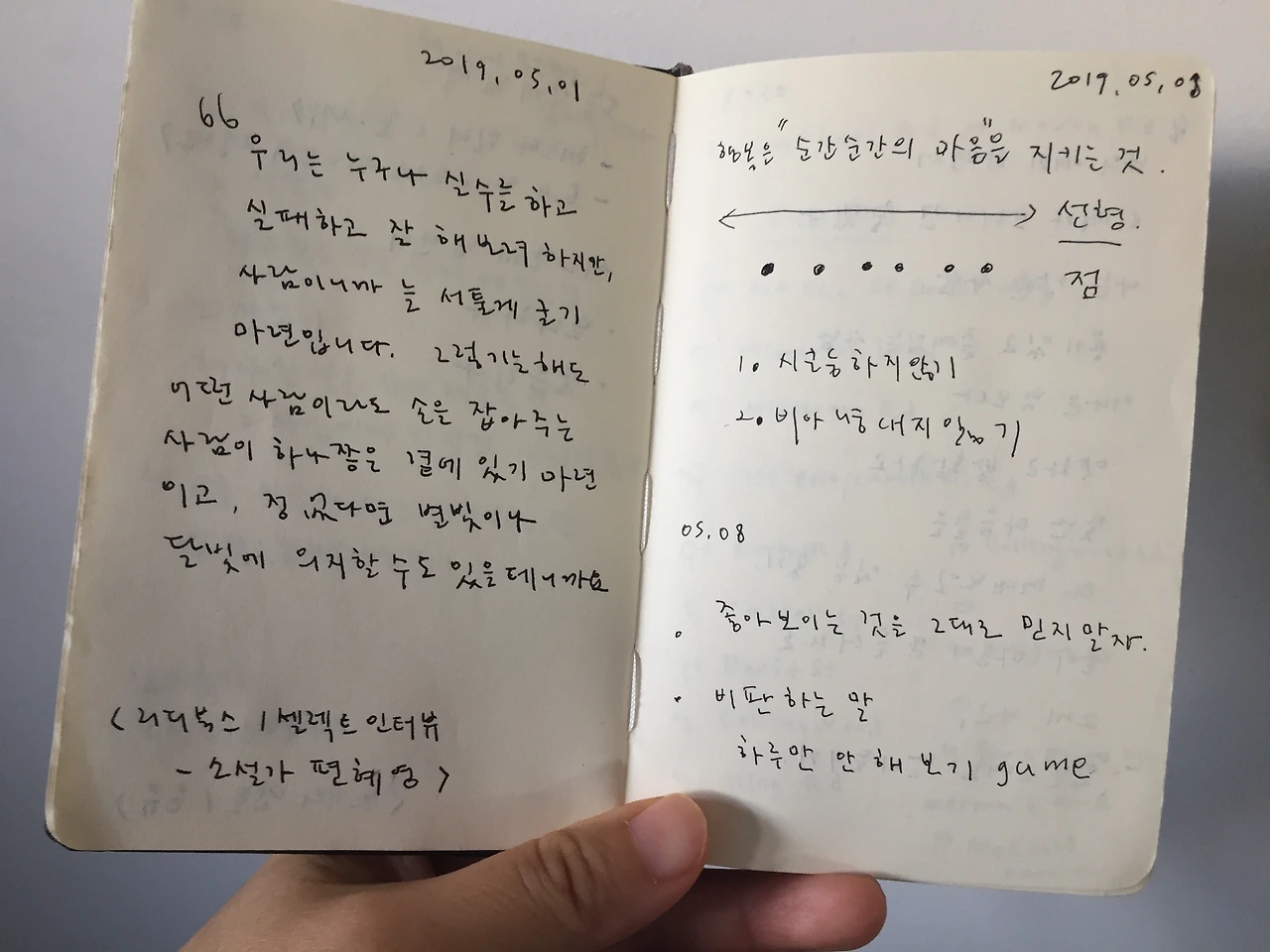 오른쪽 메모했을 때가 기억나네요. 제가 사는 곳에서 차로 6시간 떨어진 곳에서 캠핑 여행을 하던 때였어요. 캠핑장 근처 카페에서 갑자기 든 생각을 적었고, 카페 풍경이 생생하게 기억나요. 메모 한 줄에 그때와 관련된 경험까지 떠오르는 게 신기합니다.