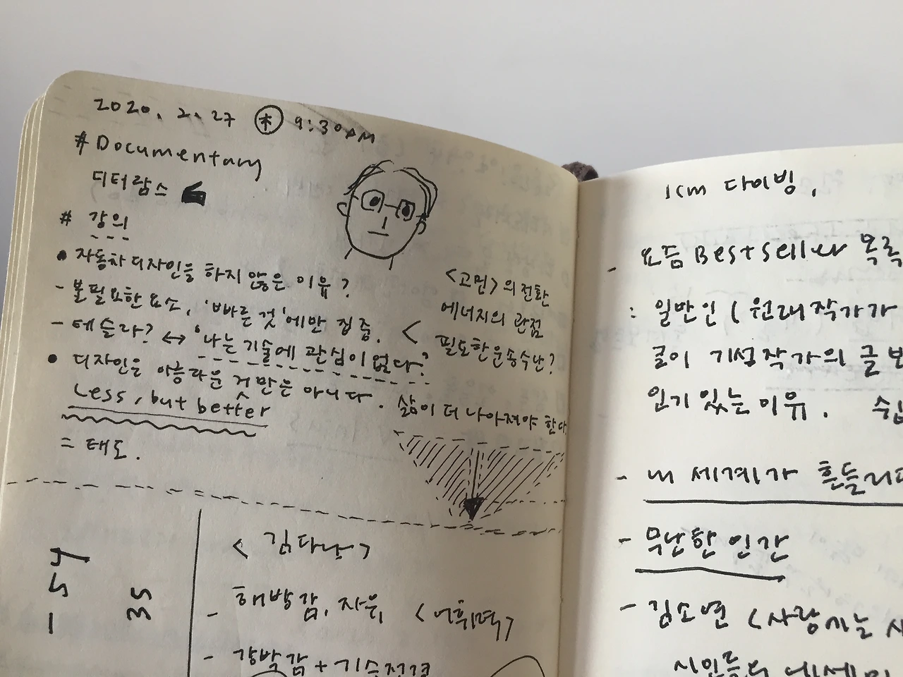 독일 디자이너 디터람스에 관한 다큐멘터리를 보고 메모를 했네요. 그림 잘 그리고 싶은데, 그림.. 똥 손...입니다.