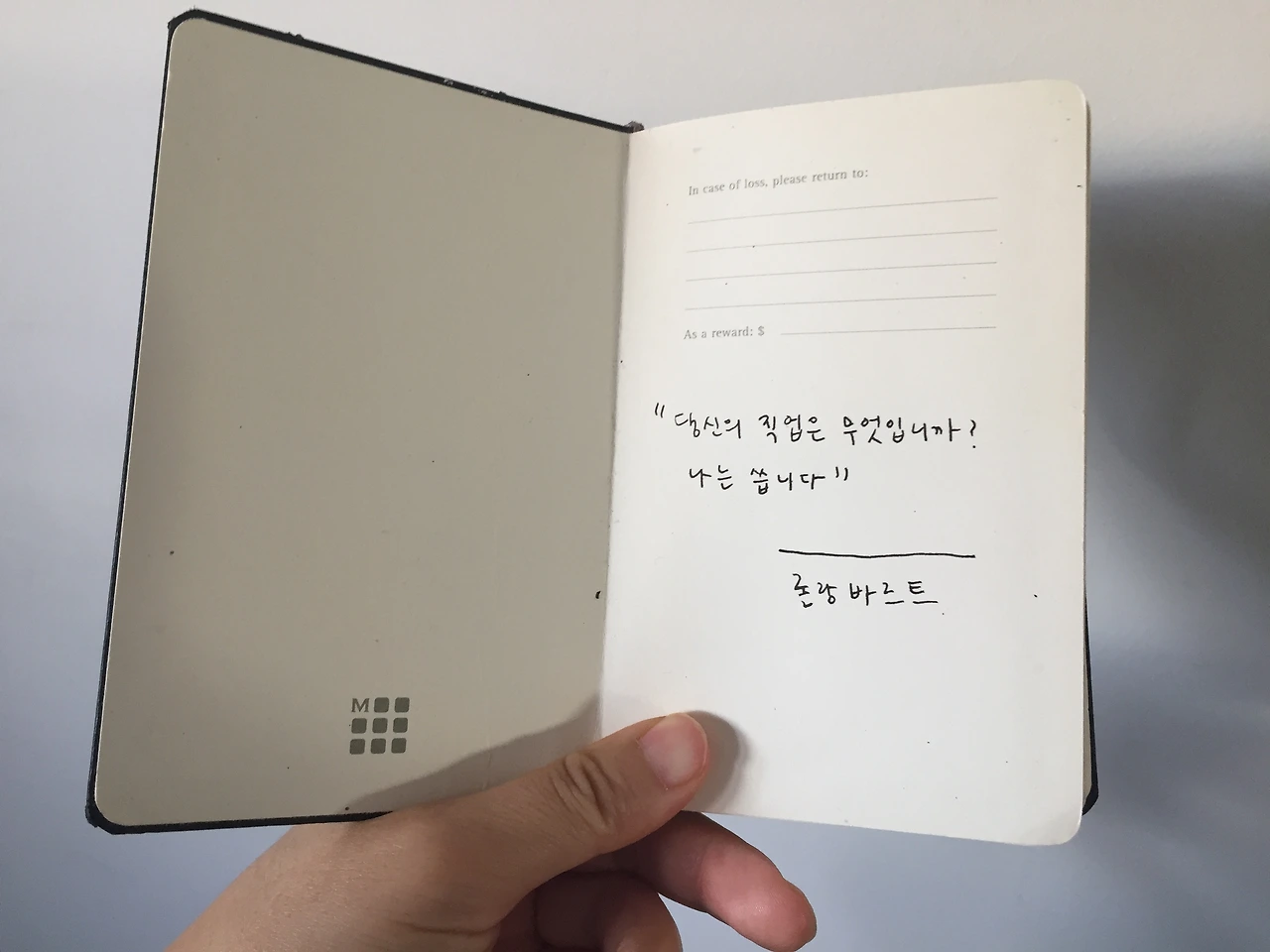 사이즈와 상관없이 앞표지는 같습니다. 왼쪽엔 몰스킨 로고가 오른쪽에는 잃어버리면 보상금을 주겠다.... 는 페이지 ㅋㅋㅋ 저는 명언을 필사해보았습니다. 지금과 글씨체가 많이 달라요. 저때는 아무 생각 없이 흘려 쓰곤 했네요.