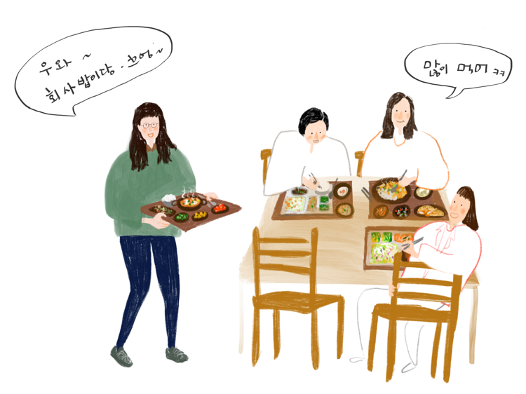 친구가 회사 동료에게 대학 친구들이랑 구내식당 간다니깐 동료들이 왜 하필 거기서 회동을 하냐는 말에