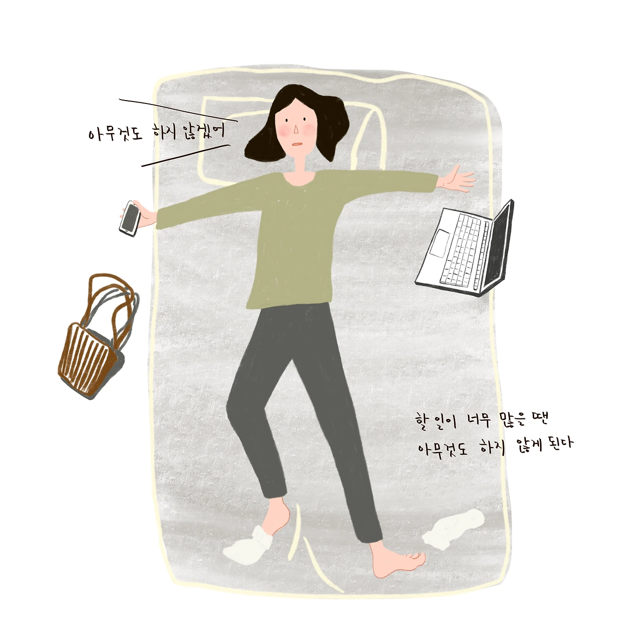 최대한 미루고 미루어 아무것도 하지 않는 시간을 가지게 됩니다.