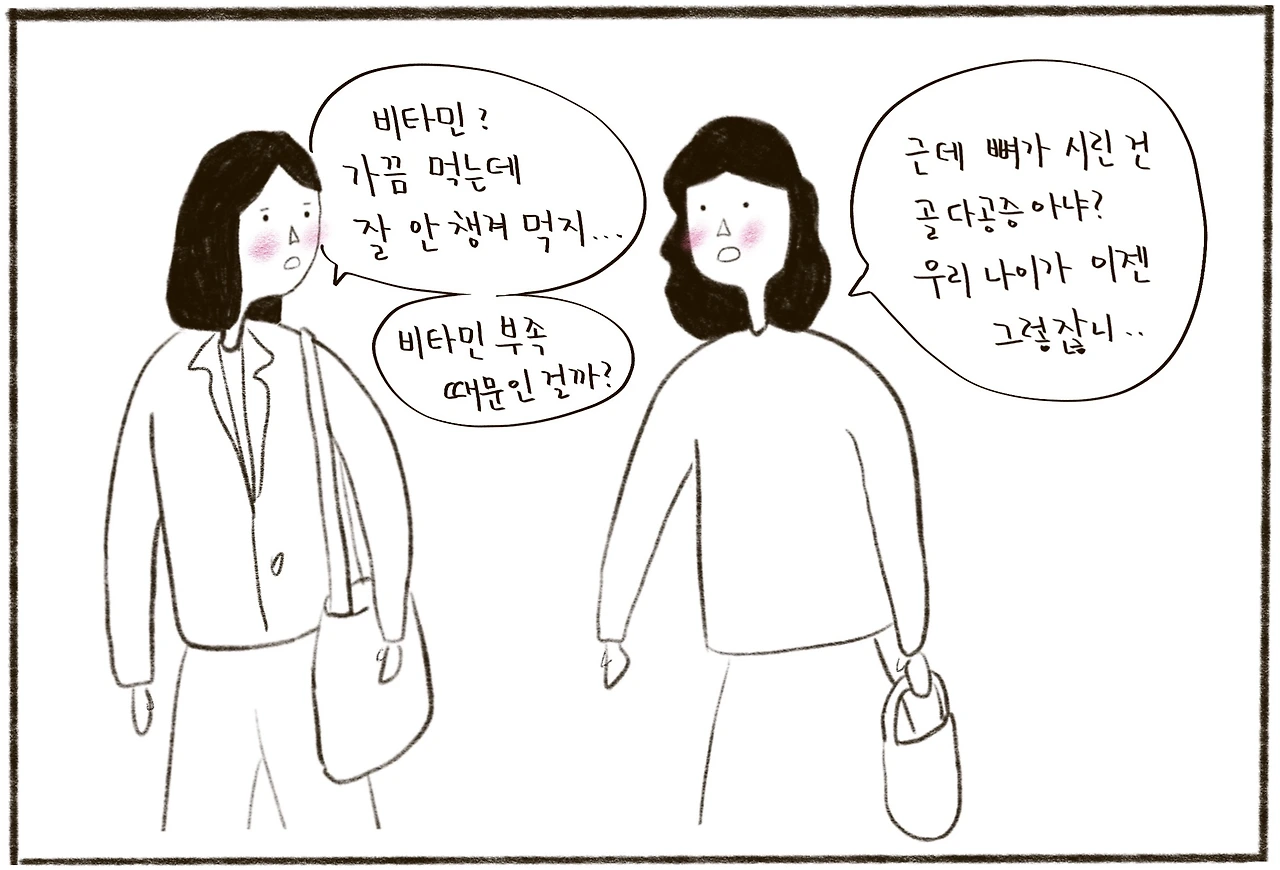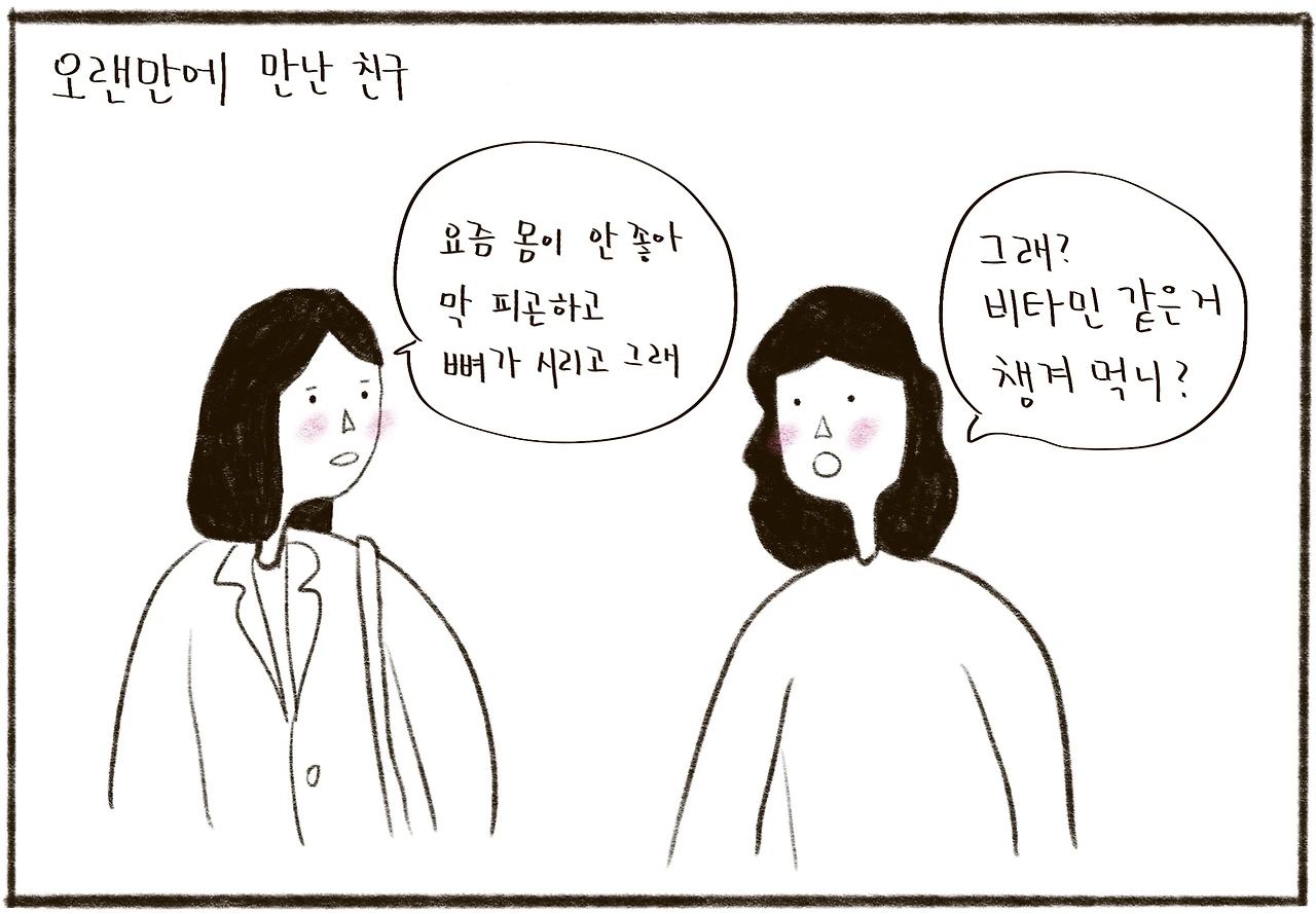 오랜만에 만난 친구와 노화와 호르몬의 변화로 골다공증이 생길수도 있다며 비타민과 칼슘제를 챙겨 먹어야 한다는 이야기를 하는데 기분이 묘했습니다.