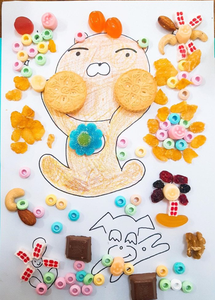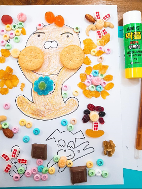 (딱풀로 붙여가며 먹어가며 이 작업 아이들은 엄청 좋아합니다.)