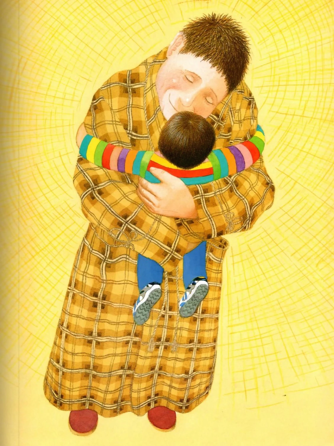(사랑하는 아빠가 꼭 안아 줄 때 햇살이 따뜻하게 감싸고 있다. 아이의 옷은 무지개 색동옷이다.)