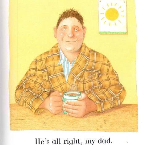 아침 식탁에 앉은 아빠. 잠이 덜 깬 표정이지만 아빠는 웃고 있다. 아빠는 태양임을 상징하는 액자그림.