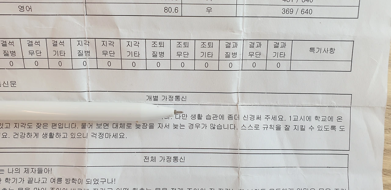 우연히 작은 녀석의 중학교 1학년 때 성적표를 발견했다. 이 성적표를 보고 얼마나 웃었는지...