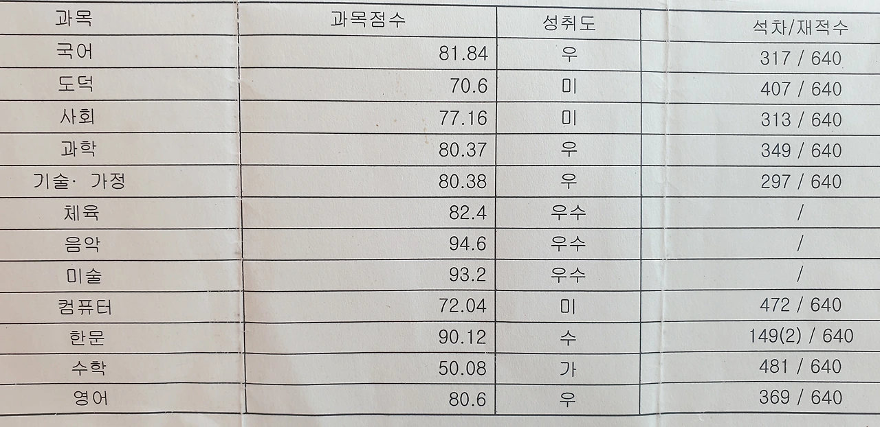그리하여 중학교 1학년 1학기 성적표를 보니 기가 막히면서도 많은 감정이 오간다. 지금 보니 학원 안 다니고 시험공부도 대충 한 거에 비하면 나쁘지 않은 성적이다. 심지어 당일 시험과목도 기술가정 공부했는데 학교 가니 한문 시험이었다고..... 하여 여기 기술가정 점수가 좋은 것은 전날 공부를 미리 했던 탓이고, 한문 성적이 좋은 것은 그나마 장원한자는 했기 때문이다. 과학 성적이 준수한 것은 월간 <과학쟁이> 잡지를 좋아한 탓이고. 영어점수가 준수한 것은 아기 때부터 주야장천 집에서 영어테이프를 틀어놓았기 때문이다.