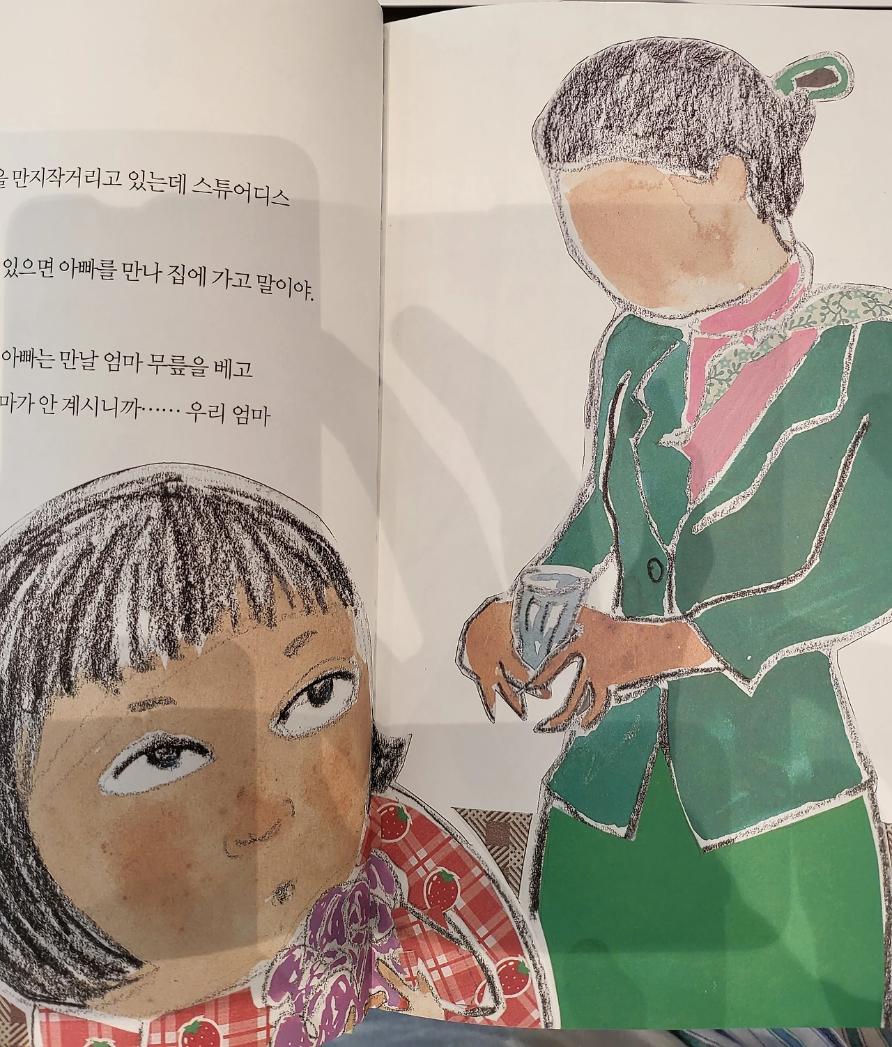 나는 대답도 하지 못하고 얼른 현관 안으로 들어섰습니다. 비행기 타고 올 때는 아빠를 만난다는 생각에 굉장히 신났는데 아빠가 보이지 않으니 막 졸렸습니다.