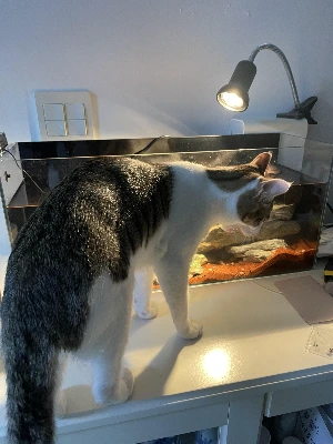 저렇게 수시로 어항에 올라가 앞발로 물을 툭툭치고 어항을 뚫어져라 쳐다보니 이제 거북이가 환장합니다. 안 그래도 예민한데 집채만 한 생물이 앞에서 얼쩡거리면 저 같아도 엄청 스트레스받을 것 같습니다.