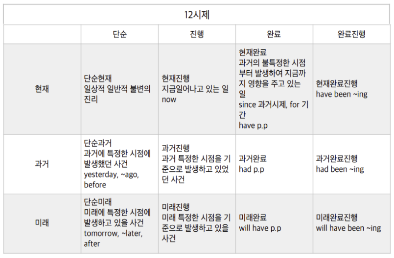 우리말에 시제가 몇 개 있는지도 모르는데, 영어는 일단 12시제가 있다.