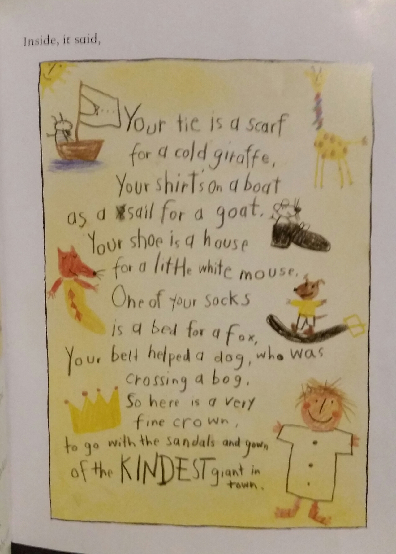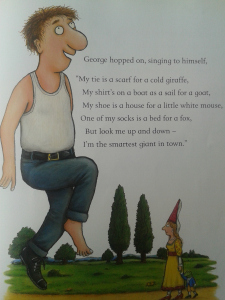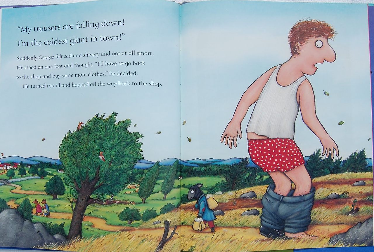 도와주는 동물이 많아질수록 노래는 길어지고 조지는 점점 헐벗는데... 그래도 항상 조지의 노래는, "그래도 난 마을에서 가장 멋진 거인이야"라고 끝나는데요.