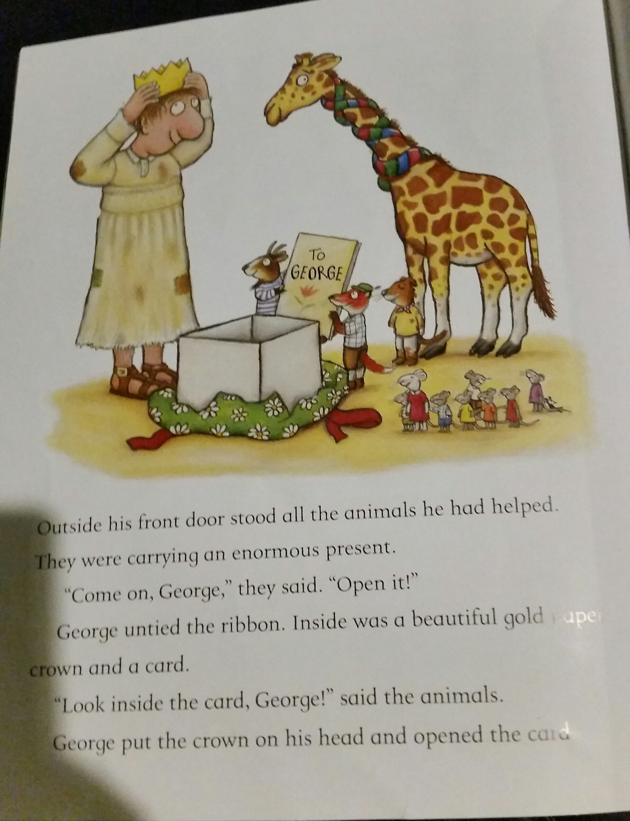 바로 왕관과 동물들이 준비한 카드죠. 동물들은 조지의 노래를 모두 모아 예쁜 카드로 만들어서 왕관과 함께 선물합니다. 마지막 후렴은 동물들이 만들었어요.