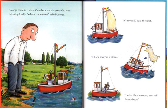 조지는 망설임 없이 새 옷을 벗어서 동물들에게 줍니다. 넥타이를 풀어 기린의 목에 감아 주고, 셔츠를 벗어 염소의 돛으로 삼아 주고, 신발을 벗어 쥐 가족의 집으로 선물하지요. 그리고 노래를 흥얼거리며 집으로 향합니다.