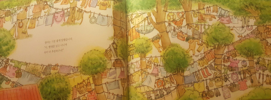 오늘 소개해 드릴 동화책은 읽을 때마다 아들보다 제가 더 신이 나는, <도깨비를 빨아 버린 우리 엄마>라는 책입니다. 이 책은 한 마디로 엄마 히어로 물이에요. 어릴 땐 누구보다 위대해 보였던 엄마들... 엄마들은 항상 무언가를 해냈죠. 김치를 백 포기씩 하기도 하고, 커다란 레이스를 뜨기도 했고, 매일 밥을 차려주기도 했고, 모르는 게 없었어요.
