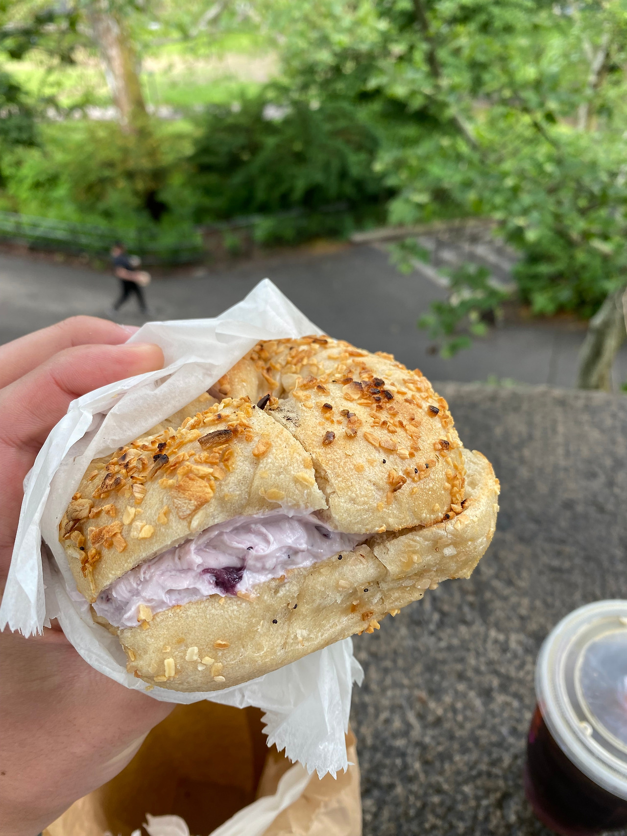 역시나 가게 밖에도 줄이 길게 나와있었고, 안에서는 열심히 베이글을 찍어내고 있었다. 단순히 베이글을 납품받아서 팔기만 하는 줄 알았는데, 그게 아니었나 보다. 한편, 밖에서부터 줄을 기다려 들어왔는데 'CASH ONLY'라는 끔찍한 문구를 보았지만, 이미 나는 계산대 앞이었고, 내 지갑엔 현금이 없었다. 결국은 주문부터 먼저 하고 점원이 안내해준 Bank of America 지점의 ATM에 가서 20달러를 뽑아 들고 왔다. 수수료 3달러는 덤... 능숙하게 안내해주는 걸 보니 이런 경우가 많았나 보다. '이렇게 까지 해서 사 먹어야 했나' 였던 내 생각은 한입 베어 물자 말자 '이렇게 까지 해서 먹어본 게 다행이다'로 바뀌었다. 아낌없이 넣어주는 크림치즈와 갓 구운 수제 베이글의 조합은 지금까지 내가 먹어본 베이글과는 레벨이 달랐다. 아직까지 이 베이글은 뉴욕에서 가성비 최고였던 음식으로 기억에 남는다.