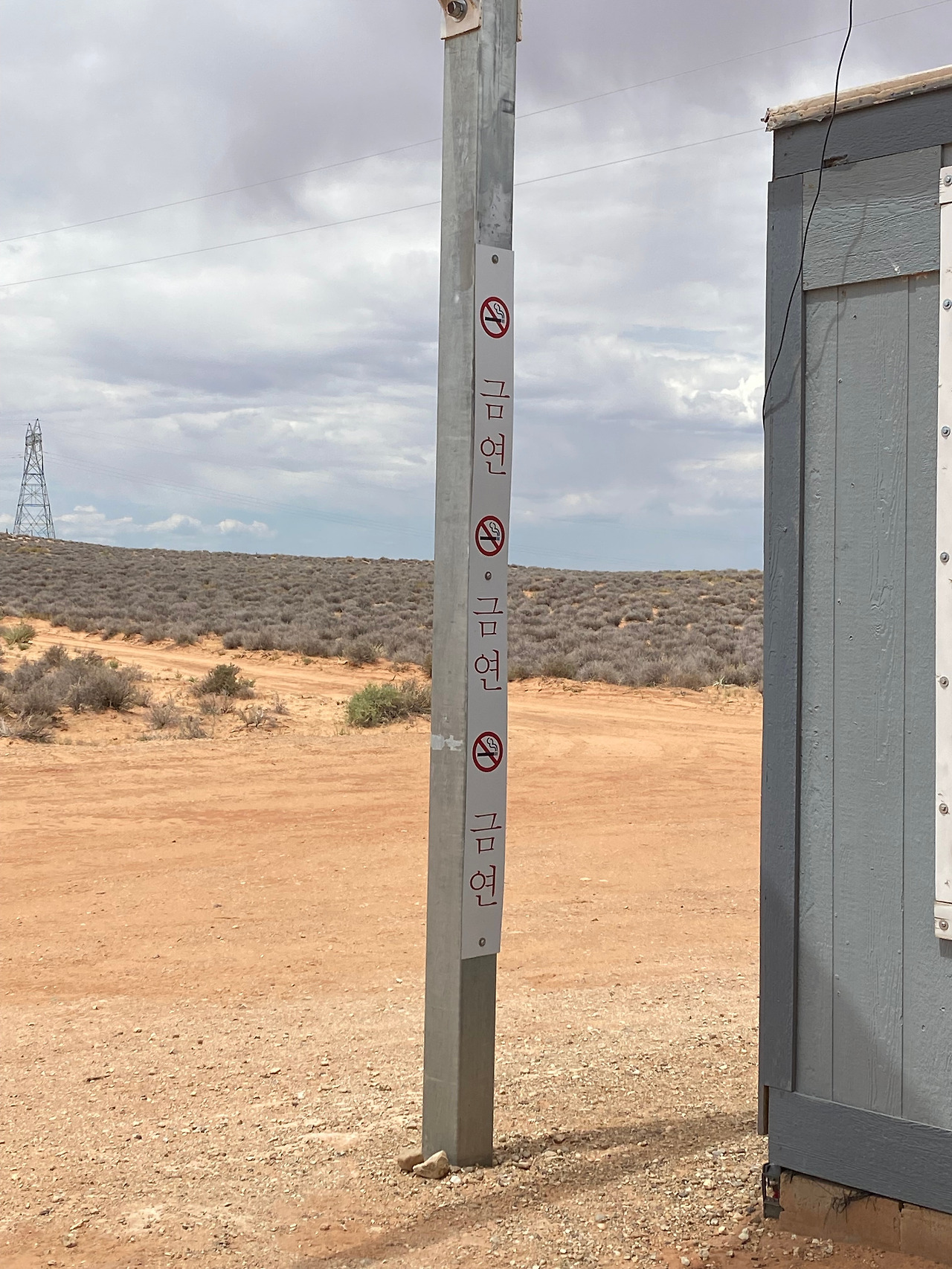 한편, 입구 쪽에는 작은 컨테이너 박스처럼 생긴 사무소가 있었고, 바로 옆 기둥에는 상당히 익숙한 한글을 볼 수 있었다. 우습게도 그 글자는 '금연'이었다. 미국에서 한국어로 된 간판은 종종 봤지만, 이렇게 '금연'표시가 쓰인 걸 보는 건 처음이었다.