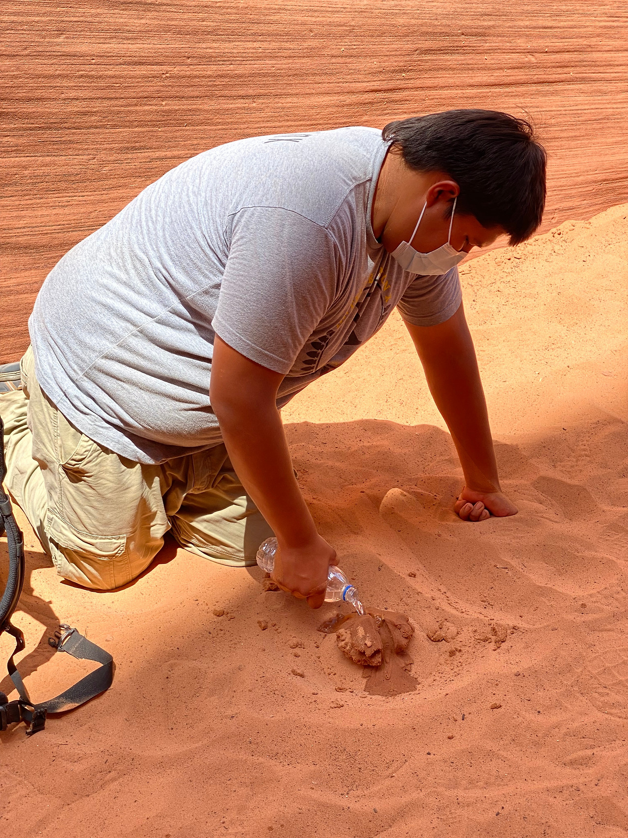 Antelope canyon은 여러 섹터로 나눠져 있는데, 두 번째 섹터를 들어가기 전에 입구에서 갑자기 가이드가 아무 말 없이 무릎을 꿇고 땅바닥의 모래를 손으로 모아 산을 만들고 갑자기 그 위에 물을 부었다. 이 계곡 안에 그들이 모시는 조상신 같은 게 있어서, 감히 (원주민 입장에서)어리석은 이방인들을 들이기 전에 조상신에게 용서를 구하는 통과의례인 줄 알았다.