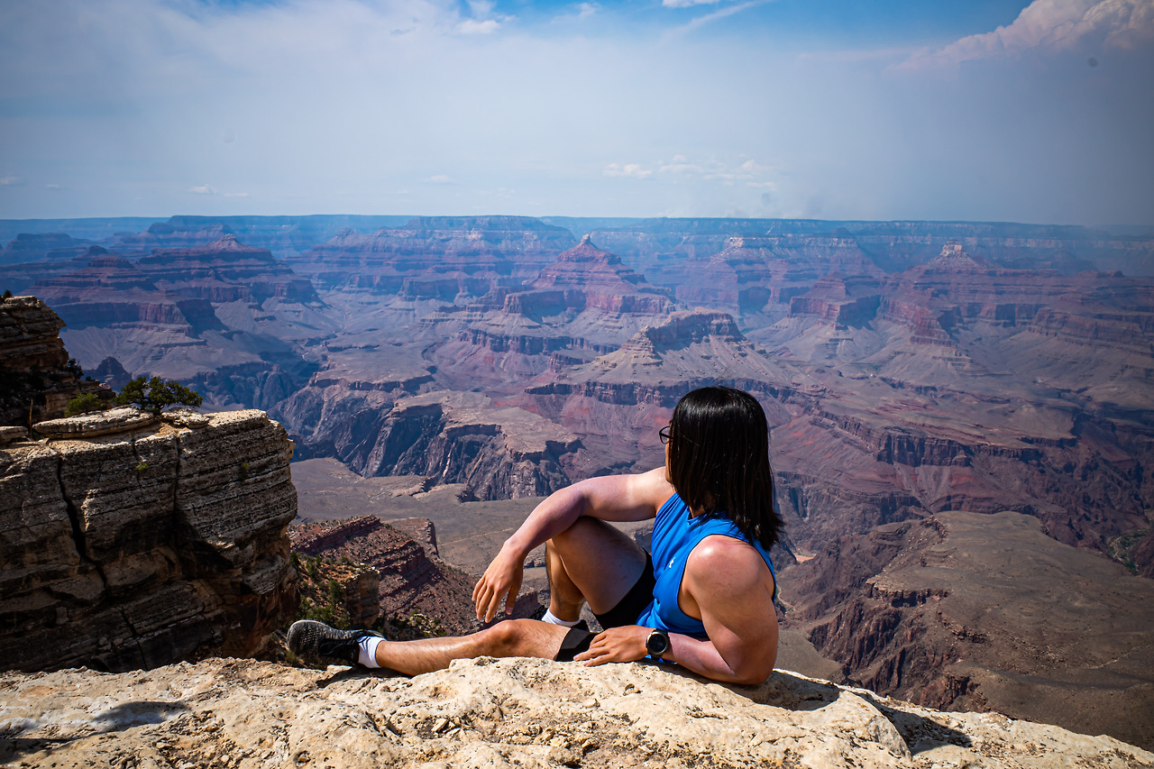 여기저기 다니면서 사진 스폿을 찾고 있던 중, 절벽 끄트머리에 어떤 백인 여성분이 아무렇지 않게 앉아서 그랜드캐니언을 내려다보고 있었다. 그러다가 카메라를 들고 다니는 나를 보고 찍새라고 생각했는지 사진 한 장 찍어달라고 부탁을 했다. 흔쾌히 부탁을 들어주기로 하고 핸드폰에 보이는 그림을 봤는데, '와 여기다, 여기가 진짜다'라는 생각이 들었다. 바로 I와 H를 불러서 여기서 꼭 사진을 찍어야 한다고 불러 모았다.