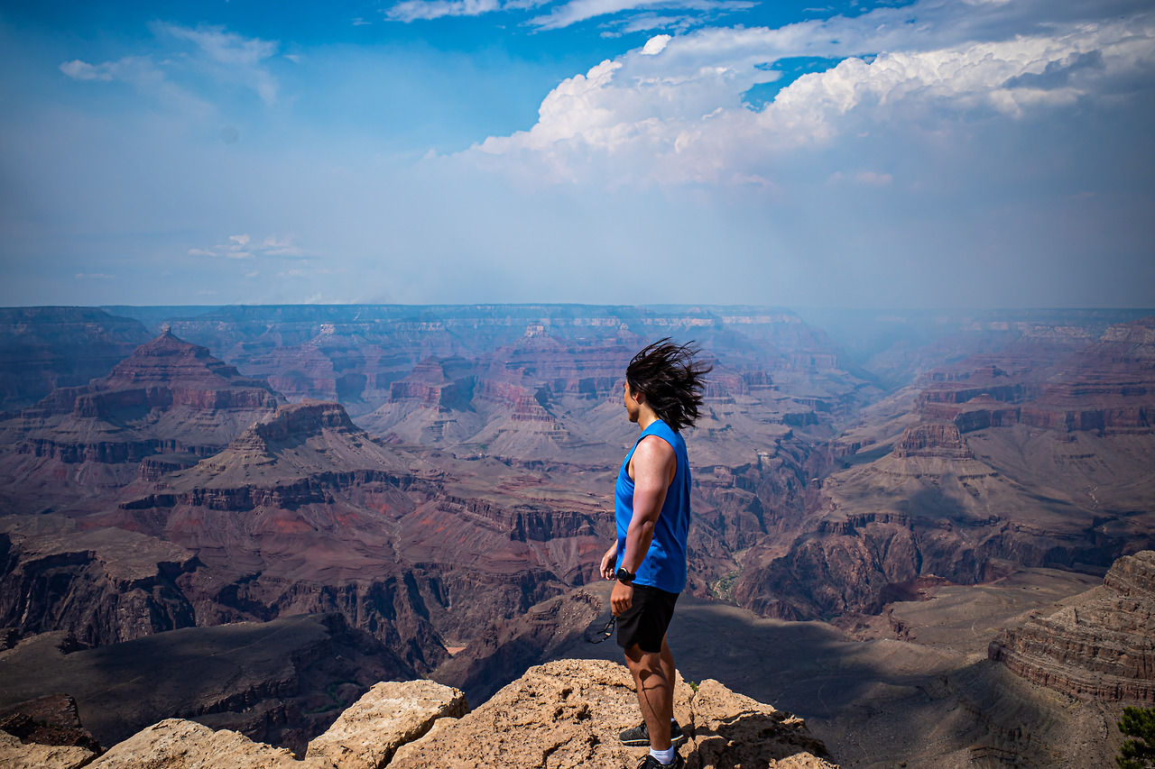 봐도 봐도 질리지 않는 그랜드캐니언을 1시간 남짓 봤을 때였나, 갑자기 엄청난 양의 먹구름이 몰려오기 시작했다. 광활하게 펼쳐진 하늘 덕분에 심상치 않은 기운을 더욱 잘 느낄 수 있었다. 마지막 단체사진을 한 장 찍고 우리는 황급히 차로 향했다.