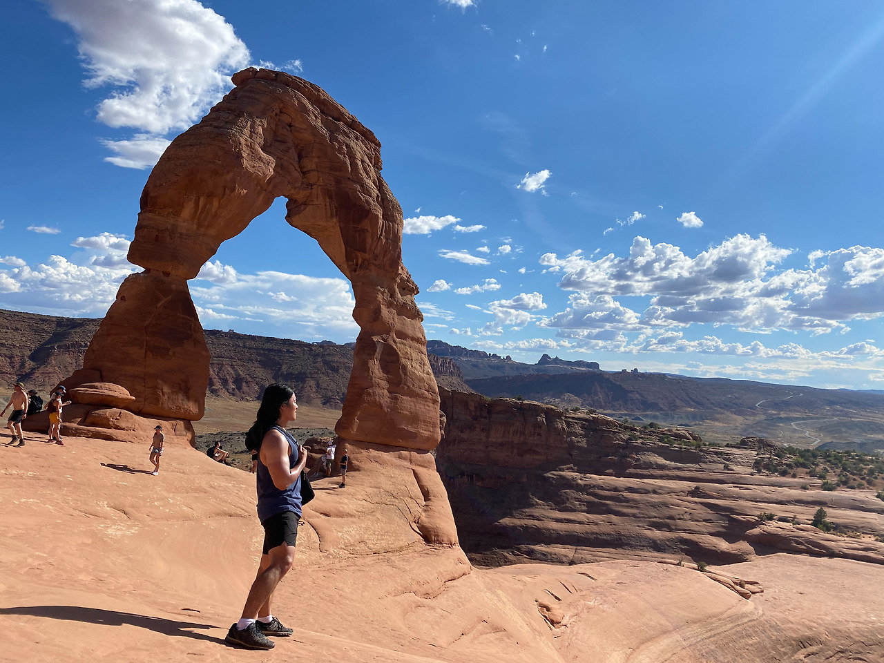 트레일을 걷다가 화장실 가고 싶어질까 봐 목마를 때만 홀짝홀짝 마셨는데, 어느새 500ml 물 한 병을 다 비워버렸다. 바싹 타는 사막의 햇빛 아래서 끝이 어딘지 알 수조차 없는 길을 계속 걷다 보니, 희망고문이 따로 없었다. 그러다가 어딘가부터 사람들이 모여서 도란도란 거리는 소리가 들리기 시작했고, 곧이어 눈앞에 Delicate arch가 나타났다.