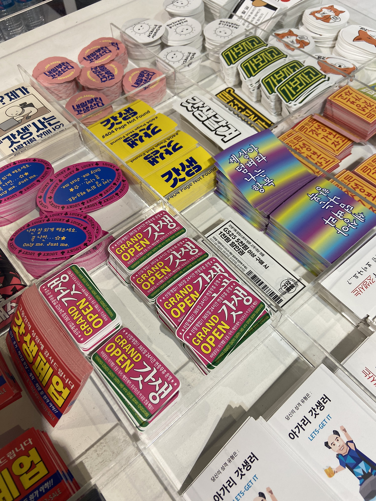 가장 인상적이었던 건 도무송 스티커 작업이었다. ‘요즘 팝업’에 빠질 수 없는 게 바로 도무송 스티커 아닌가! 도무송 스티커는 주로 노트북 같은 데 붙이는 모양 스티커인데, 그 스티커는 익숙해도 용어 자체는 처음 들었다. (‘톰슨’ 가공법이라는 인쇄 용어가 일본식 발음으로 변형되어 ‘도무송’이 되었다는 흥미로운 tmi) 스티커 작업은 나를 포함한 디자인팀 전체가 참여했다. 주제는 ‘이 또한 갓생’. 처음에는 번거로울 것 같아 관련 문구를 몇 개 제안 드렸는데, 다들 더 엄청난 아이디어로 너무 재미있게 만들어주셨다. 나도 구린 실력으로 아이패드에 몇 개 끄적였다. 다행히 요즘은 발로 그린 그림체도 충분히 사랑받는 좋은 세상이라 2개 정도는 ‘프로듀스티커101’의 최종 라인업으로 선발될 수 있었다 ^^^^ 이 도무송 스티커는 ‘행복한 탕비실’에서 인스타 팔로우를 하면 나눠주는 방식으로 활용되었다.
