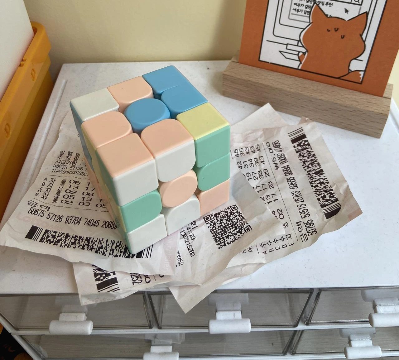 큐브도 마찬가지이다. 배우 김태리 브이라이브에서 그녀가 힘들 때마다 소소한 취미를 즐기거나 작은 성취를 하며, 효능감을 얻는다는 이야기를 듣고 무작정 따라 했었다. 그녀가 말하길 큐브도 삐걱삐걱 유튜브 보면서 맞추다 보면 어느새 완성된다고 했다. 유튜브로 큐브를 맞춘다고? 의심스러웠지만 왠지 모르게 그녀가 말하니 믿음이 가는 게 아닌가. 다음 날 다이소에서 2천 원짜리 큐브를 사서 해보았고, 삐걱삐걱 맞추다 보니 이게 정말 되는 것이다! 큐브는 천재들만 하는 줄 알았는데 말이다! (작은 성취가 몹시도 필요했던 팝업 준비 기간 동안 무수히 맞춰 지금은 큐브 왕이 되었다!)