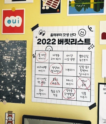 그 외의 소품 중 몇 개는 배우 김태리 브이라이브에서 아이디어를 얻었다. 나는 드라마 덕후이기 때문에 그즈음 끝난 <스물다섯 스물하나>도 당연히 보고, 슬퍼했다. 배기진,……외않되?ㅠㅠㅠ 드라마를 보면서 배우 김태리의 귀여운 씩씩함이 마음에 들어 이것저것 찾아보다가, 그녀가 연초마다 한 해의 버킷리스트 빙고 판을 만든다는 사실을 알게 되었다. 하나 하나 뜯어보면 ‘다리 찢기’ 같이 소소한 목표인데 그런 것들을 버킷리스트 빙고판에 쓴다는 게 너무 귀여웠다. 이런 건 당연히 못 참기 때문에 늦었지만…나도 해봤고, 네넵이네 방에도 붙여 두었다. 소소하지만 현실적이고, 그런데 은근히 지키기 힘든 것들. 동그라미를 쳤다가 엑스자를 다시 치는 아가리갓생러 면모도 보여주었다.