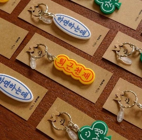 콜라보 작가 ‘아무개씨’도 섭외했다. 아무개씨는 예전에 친구 따라 들른 팝업 스토어에서 접한 일러스트 작가인데 특유의 촌스러움이 사랑스러웠다. 그 매력에 푹 빠져 홀린 듯이 귀여운 수제 키링도 만들었다. 내 소심한 좌우명 ‘내탓이냐’가 쓰여진 귀여운 키링. (스투키에도 ‘내타시냐’라는 이름을 지어서 키우고 있다) 그런데 브랜드 디자이너분이 마침 딱 ‘아무개씨’ 컨택이 가능하다고 제안하시는 게 아닌가! 수줍은 팬심으로 적극 찬성했고, 미팅 후 굿즈를 진행했다. 우리의 키 컨셉 ‘이 또한 갓생’과 결이 잘 맞는 분이라 기대보다 더 찰떡인 키 비주얼을 잡아 주셨다.