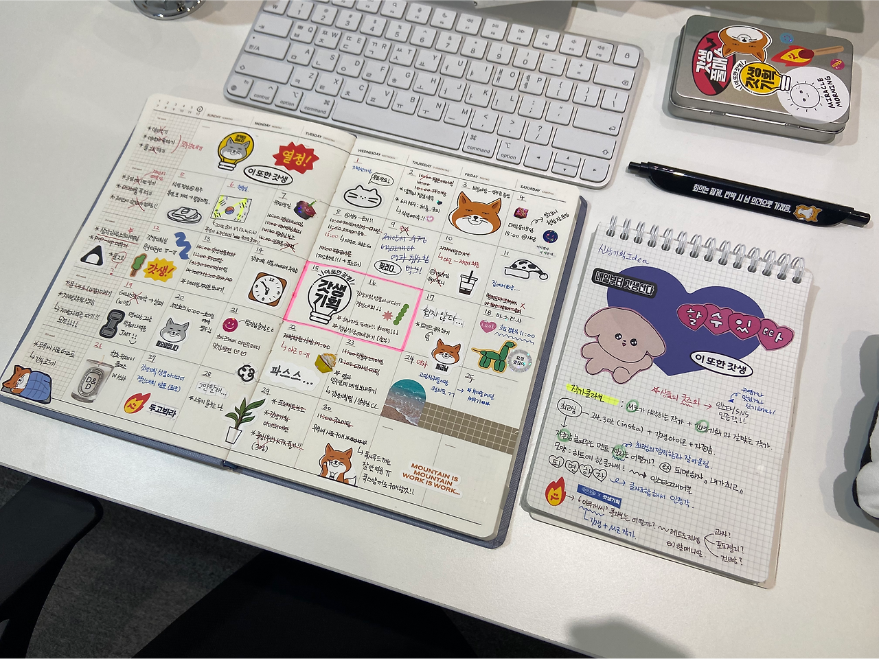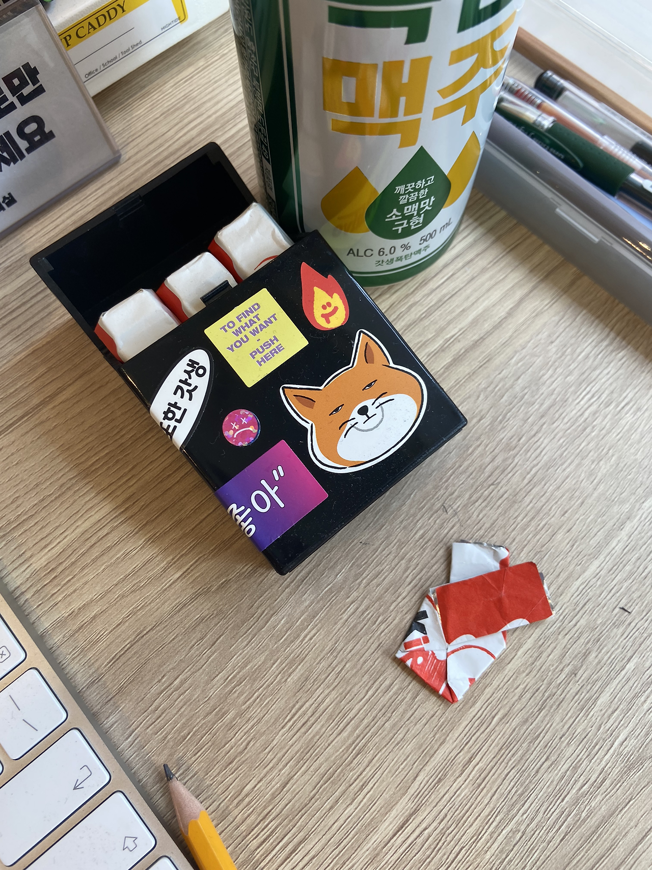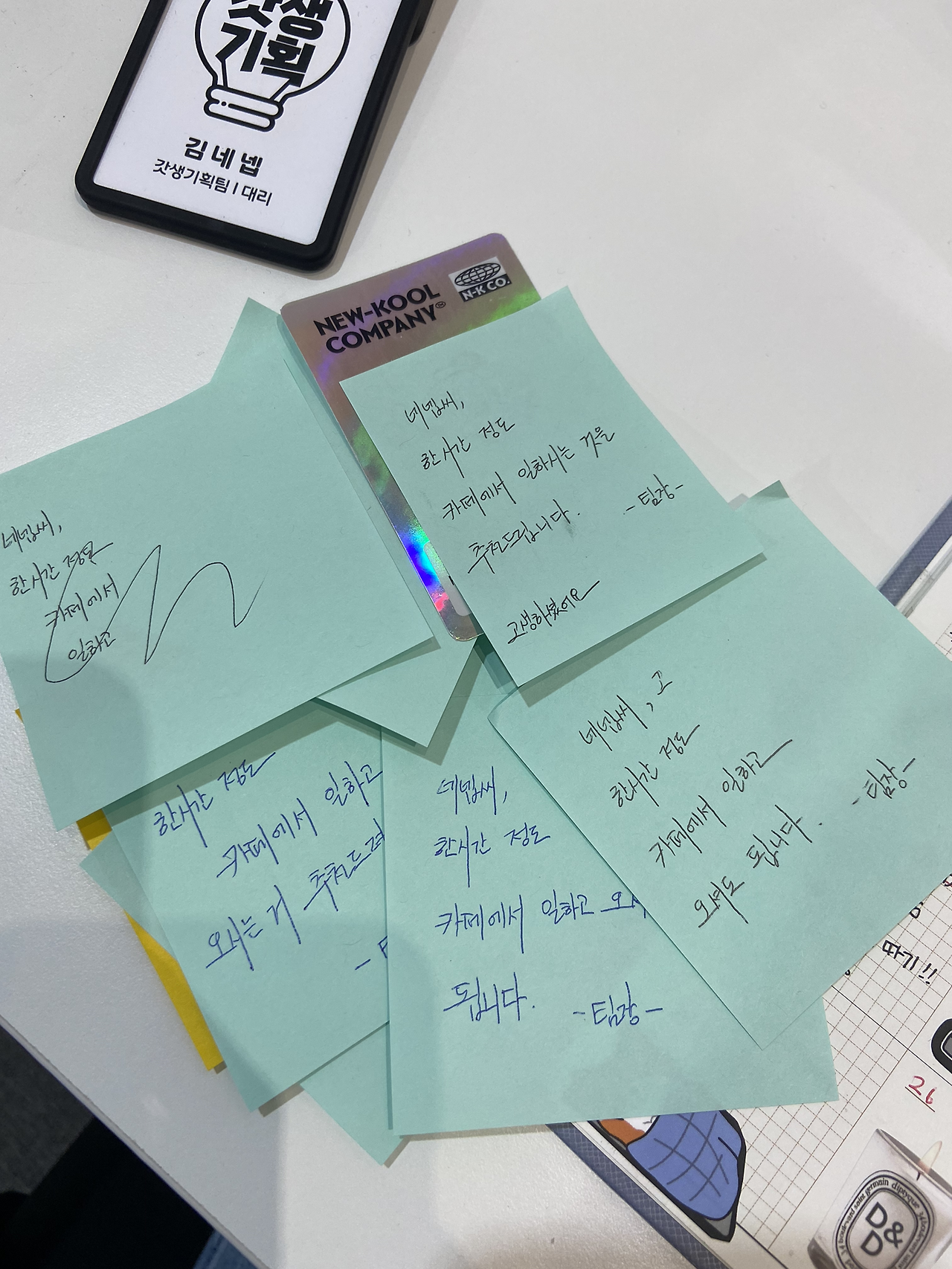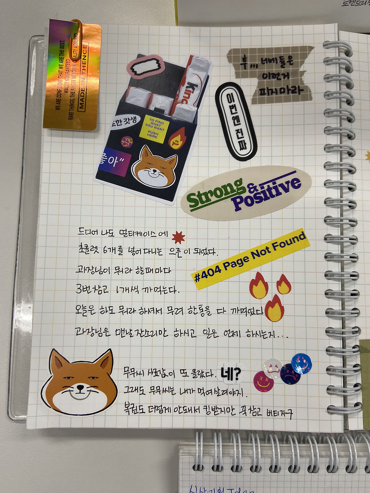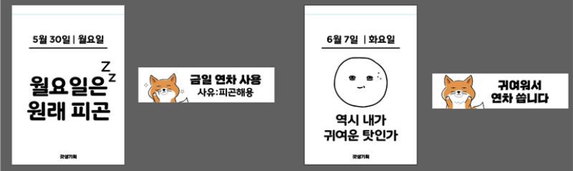 6월 다이어리를 리뉴얼하면서 네넵이 회사 동료의 쪽지, 팀장님의 법카 찬스 쪽지, 담배 케이스를 위장한 초콜릿 케이스 등을 추가했다. 인스타 유머 계정에서 긁어모았던 짤들을 활용했다. 특히 저 초콜릿 케이스는 나도 사무실에서 만들어서 쓰고 있다. (덴스 멀티 케이스가 좋습니다.) 이런 것들을 배치하면서도 누가 알아볼까 했는데, 생각보다 많은 분들이 알아보고, 웃어 주셨다.